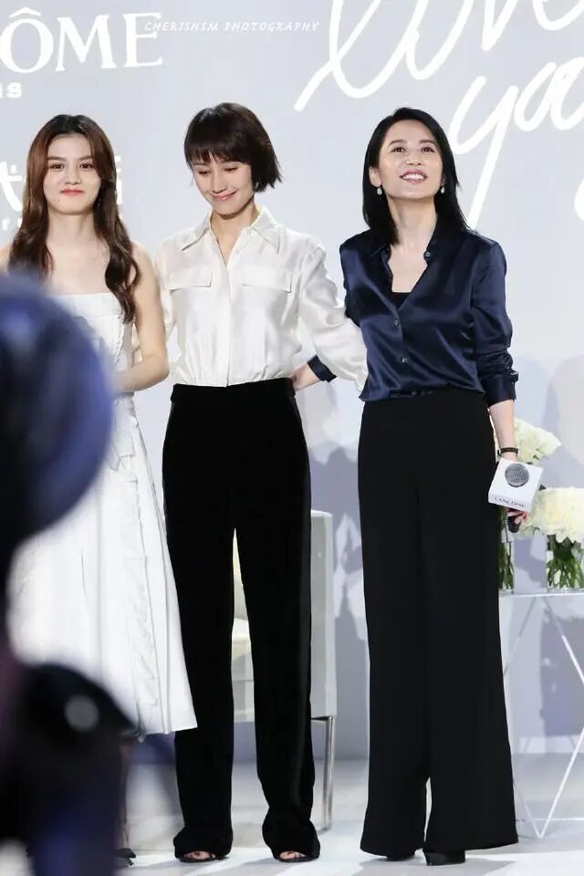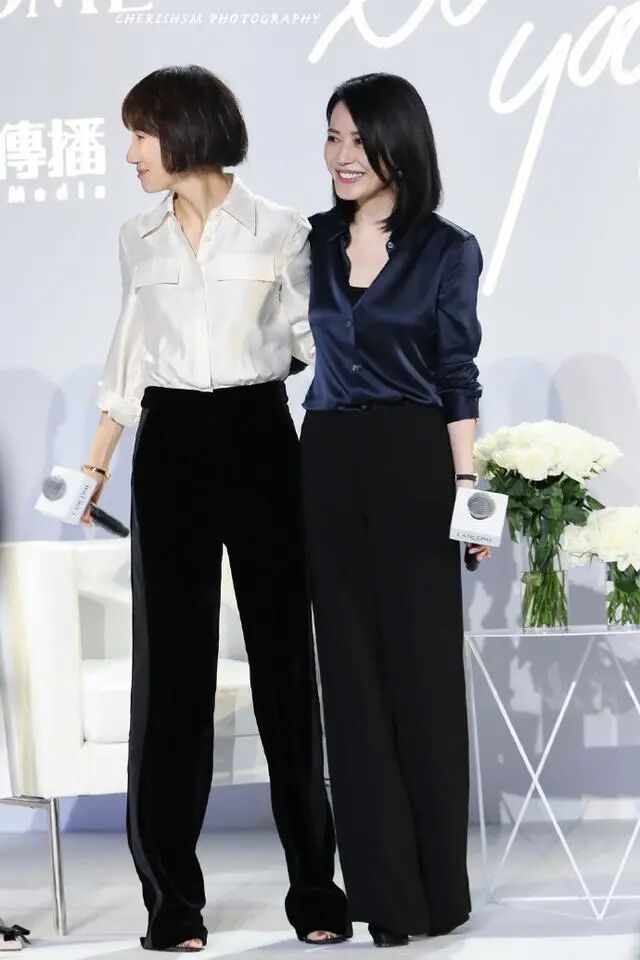 活动当天两人都选择以缎面衬衫来搭配黑色长裤,怕不是早就约好了吧,穿的都这样一致,像一对姐妹花一样,画面也更加和谐。衬衫本就是一款非常百搭的单品,以其丰富的款式,颜色和面料给大家提供更多的选择,深受人们青睐。