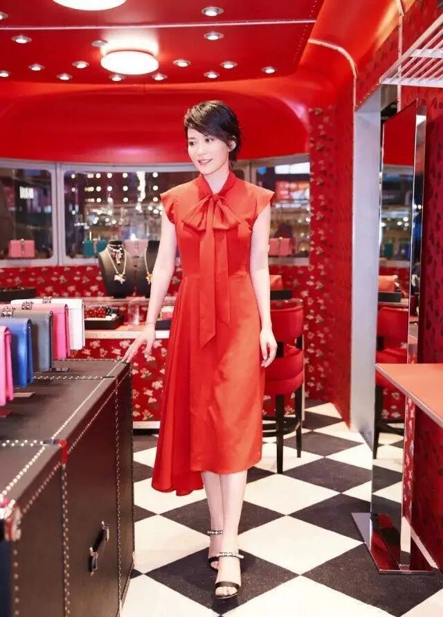 俞飞鸿的一袭红裙也非常的惊艳,衣领处的小花边和脖颈处细长蝴蝶结的线条,也使整个人看上去更加优雅甜美。连衣裙的版型非常好,轻松勾勒出窈窕身姿,不规则裙摆也比较有特点,搭配一双黑色高跟鞋,优雅又有气场。