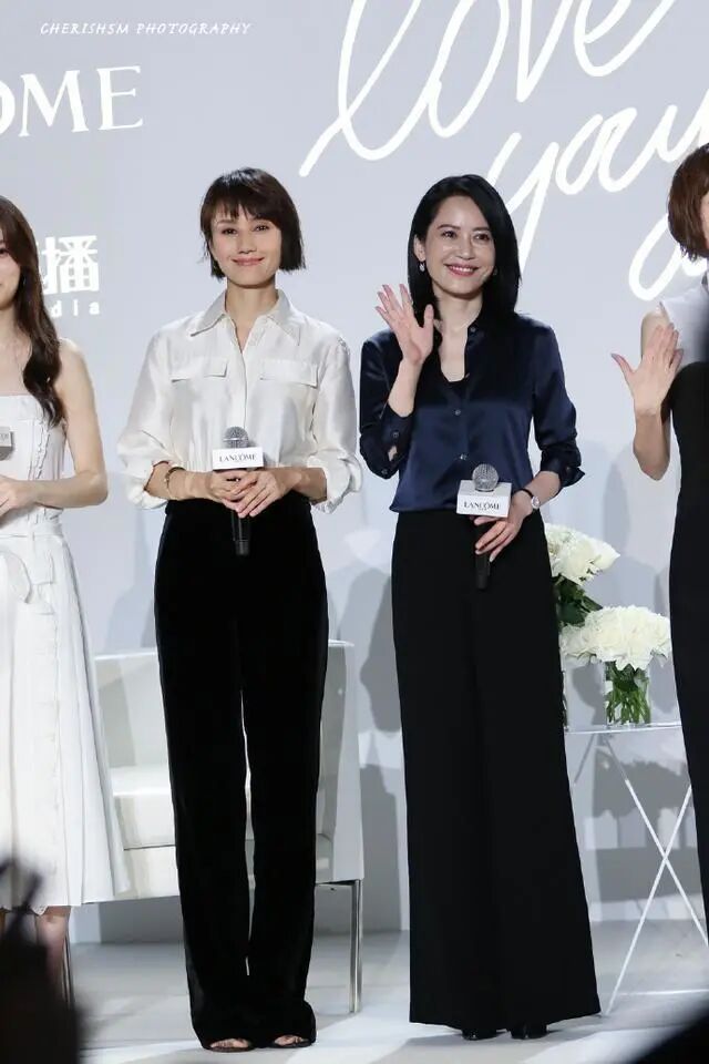 俞飞鸿则选择了一件深蓝色的衬衫,并且内搭黑色吊带,下穿黑色阔腿长裤。吊带与衬衫的结合也增添了整体层次感,深蓝色更加深邃,知性大气十分。阔腿长裤不仅能够修饰双腿线条,整体看上去也更加优雅大气,十分洒脱。俞飞鸿挥手与大家打招呼,亲和力max。看看两人这气质真的没得说,站在那里就养眼,堪称行走的气质,简直绝了。