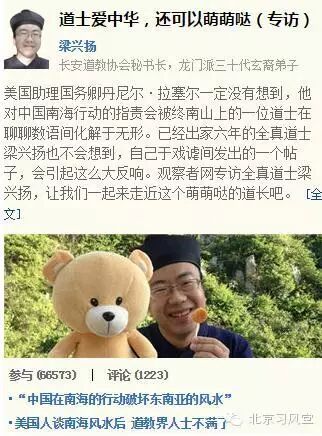 去年5月,美国助理国务卿丹尼尔拉塞尔发表了“中国在南海破坏了东南亚风水”的有趣言论,随后@全真道士梁兴扬用长微博回应了这位美国高官,称美方“盗用我大道教风水知识”,“违反国际法中关于盗版的相关规定”,博主梁兴扬道长因而也名声大噪。