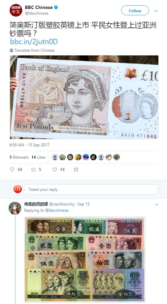然而,9月15日早上,BBC中文版推特(Twitter)却在发布这一消息时,提出了一个问题:平民女性登上过亚洲钞票吗?