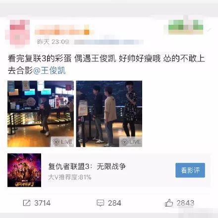昨晚有网友在电影偶遇到正在排队等待看《复仇者联盟3》的王俊凯