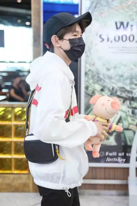 在机场的源源,手中拿着一只毛绒玩具小猪,超级萌