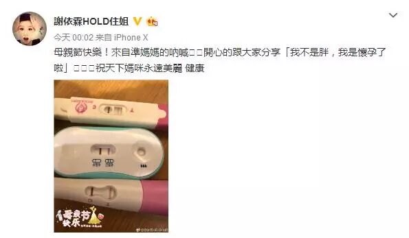 今天,正值母亲节,谢依霖微博晒出验孕棒的照片,并调皮喊话:“准妈妈的呐喊,我不是胖是怀孕了。”