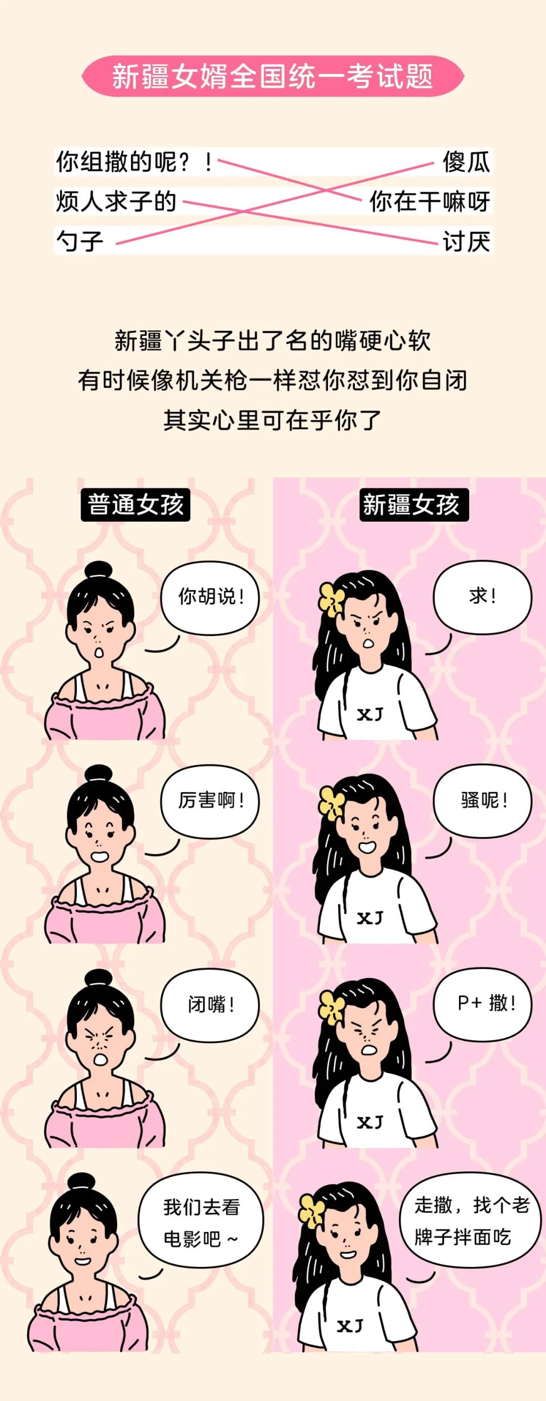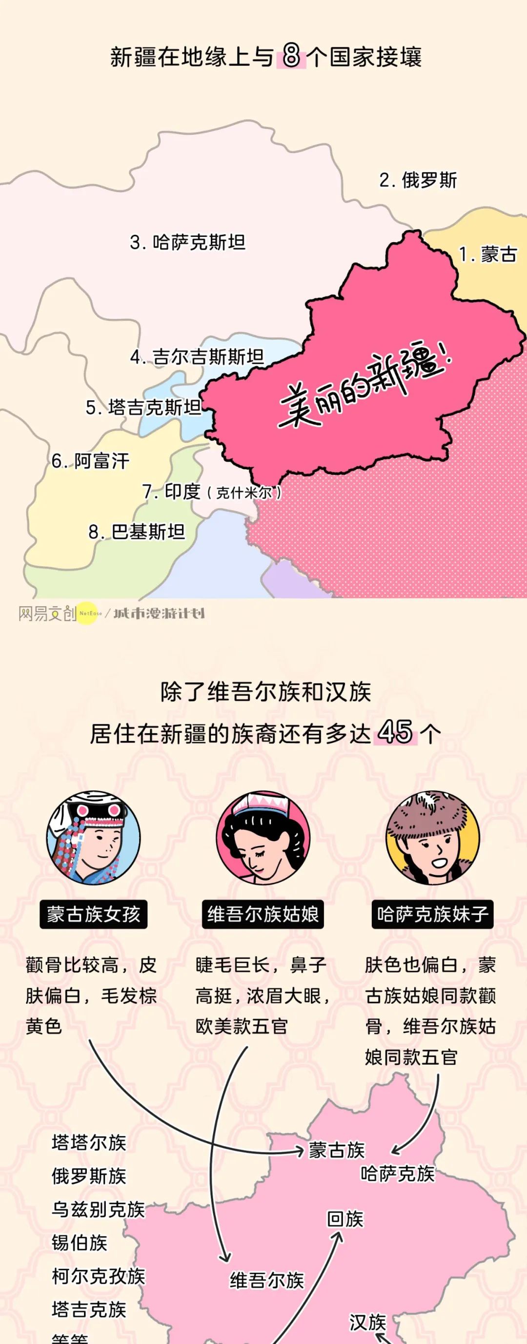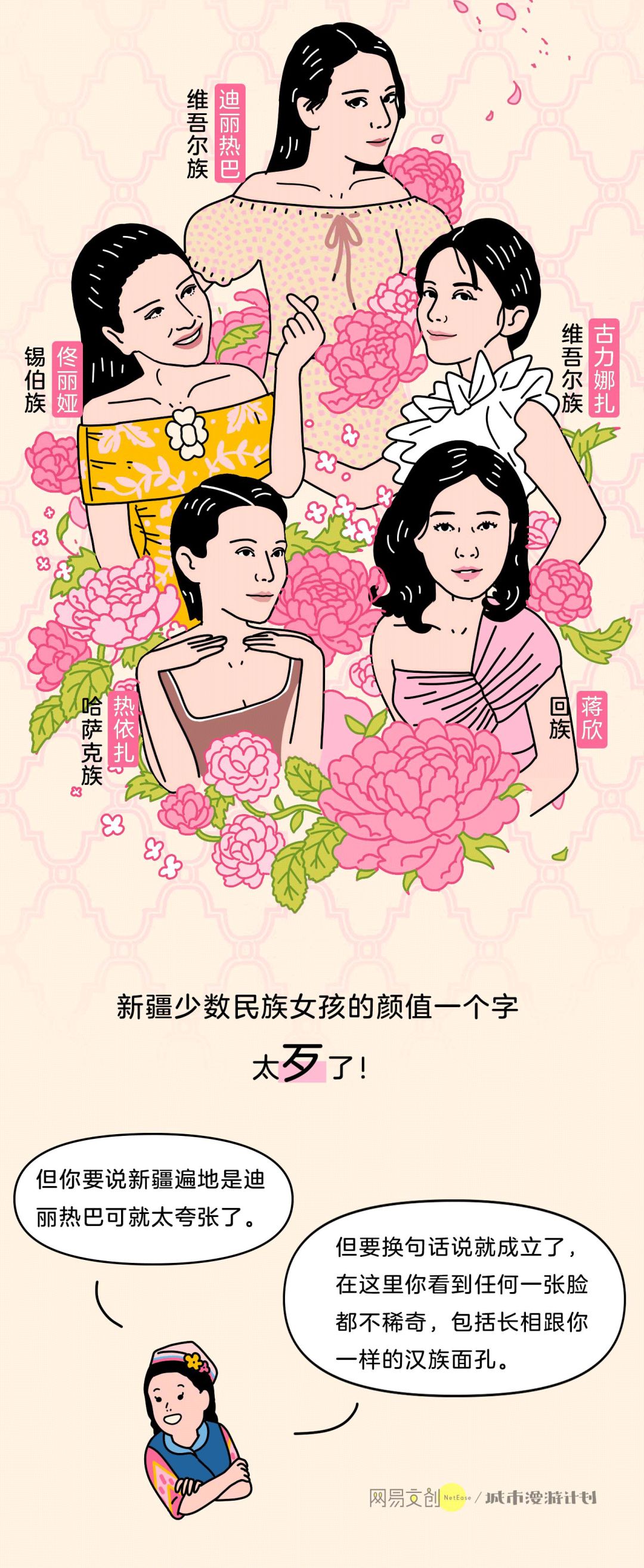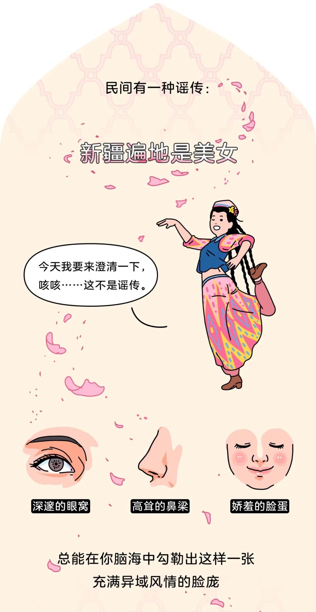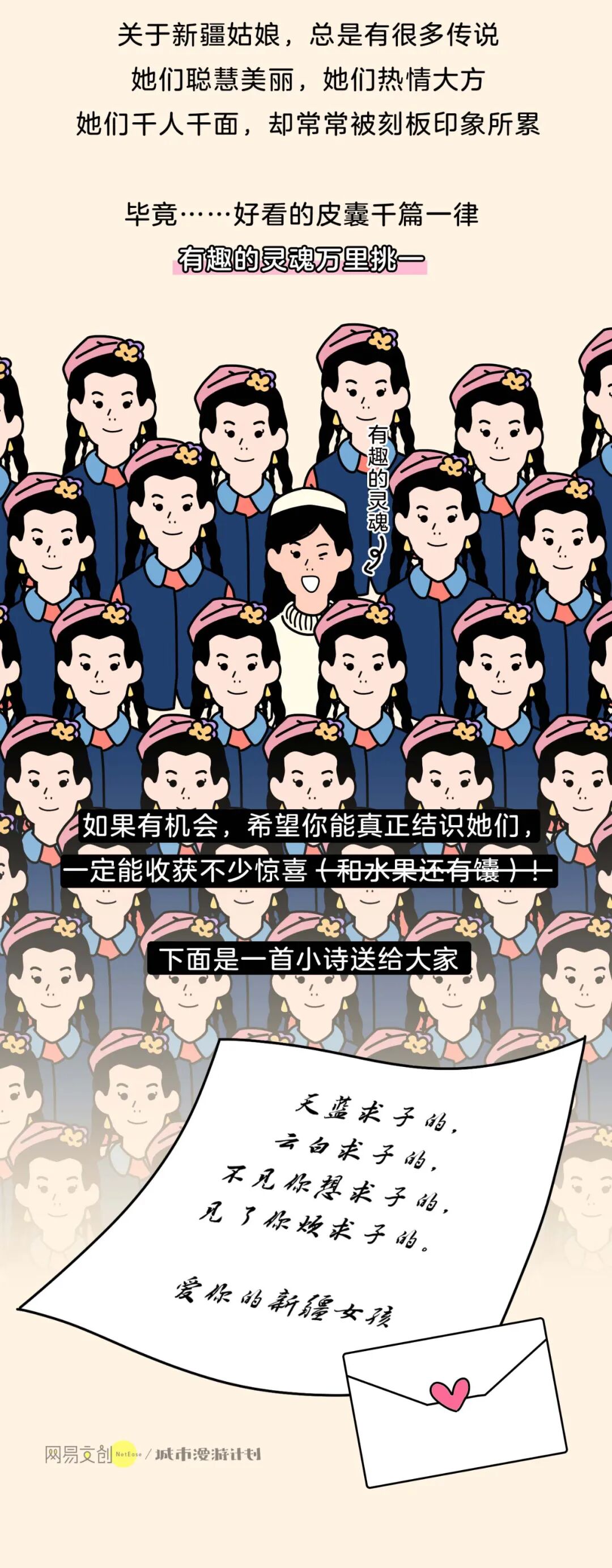 一千个新疆姑娘就有一千种面庞,也就会有一千个可爱善良的心灵。我尽可能为你们找到一些共性,美丽、善良、爽朗……可这些词语太普通,而你们之间又各有不同。我只好把你们的美好,归因于你们生长的这片美丽土地。