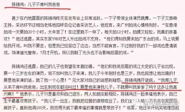 对外他没有选择马上公开,但陈锦鸿的儿子仍不会叫爸爸这件事,传的越来越广。2010年陈锦鸿接拍新片,还不忘调侃儿子,他承认儿子还不会叫爸爸,希望儿子在新剧中客串,“来演我儿子不就要叫我爹爹了?这多让我高兴啊!”