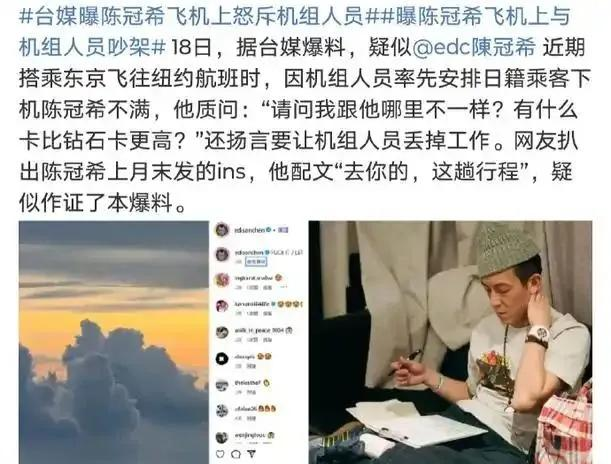 6月18日,一则关于“陈冠希怒斥机组人员”的消息登上各大媒体头条。东京飞往纽约的航班上,头等舱内,陈冠希因机组人员优先安排日籍乘客下机,与空服员发生争执。据目击者描述,当时的陈冠希情绪激动,全程用英语质问:“我跟他哪里不一样?有什么卡比钻石卡更高?”甚至扬言要让对方“丢掉工作”。这一幕被同机乘客拍下,上传至网络后,迅速引发热议。