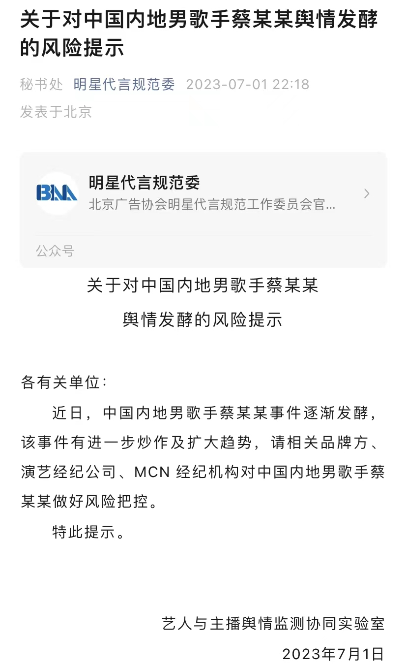 7月1日晚,北京广告协会明星代言规范委发布关于对中国内地男歌手蔡某某舆情发酵的风险提示。据悉,这位“蔡某某”即是蔡徐坤。
