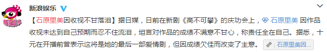 石原里美因为其主演的《高岭之花》收视率惨败,在庆功会上自责流泪。