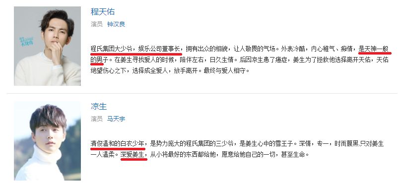 钟汉良饰演的程天佑是集团霸总,马天宇饰演的凉生是温暖男神,共同点是两人都对女主爱的死心塌地。