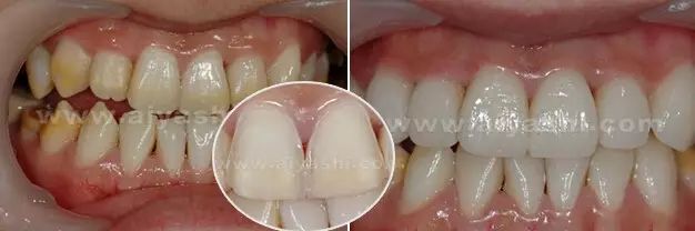 修复前:牙齿色泽、形状不佳(放大图是瓷贴面预备,磨除牙齿后的状态,可见对牙齿磨损极少)