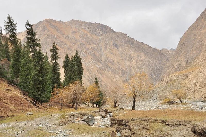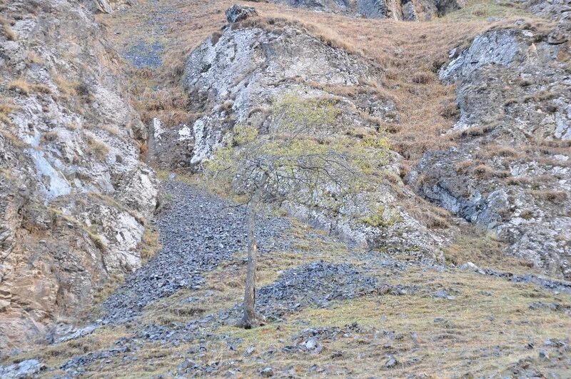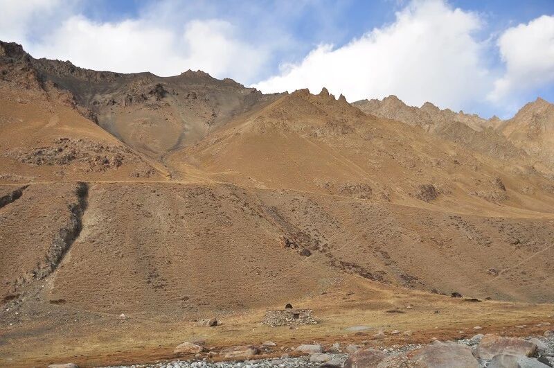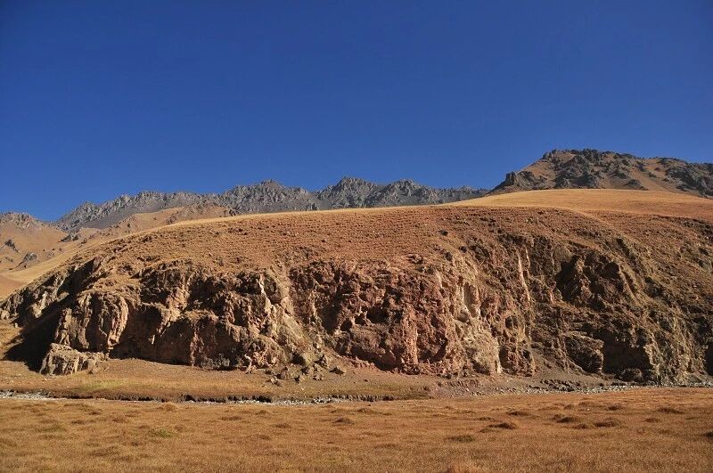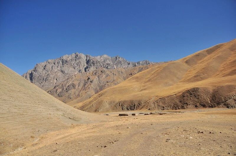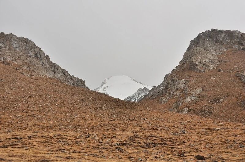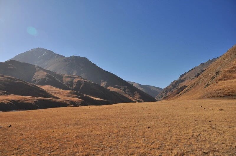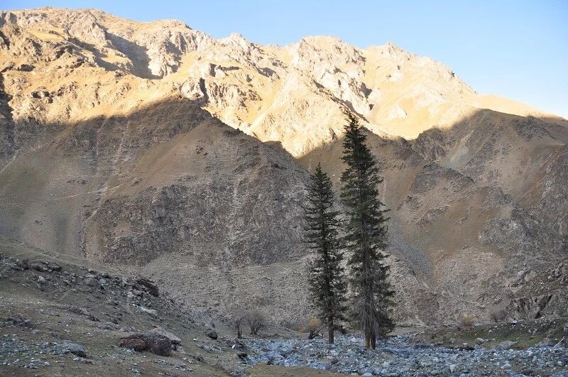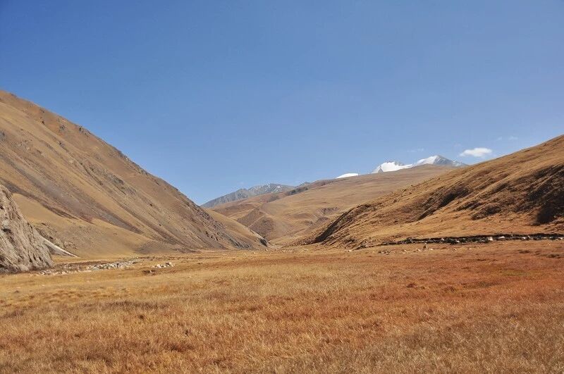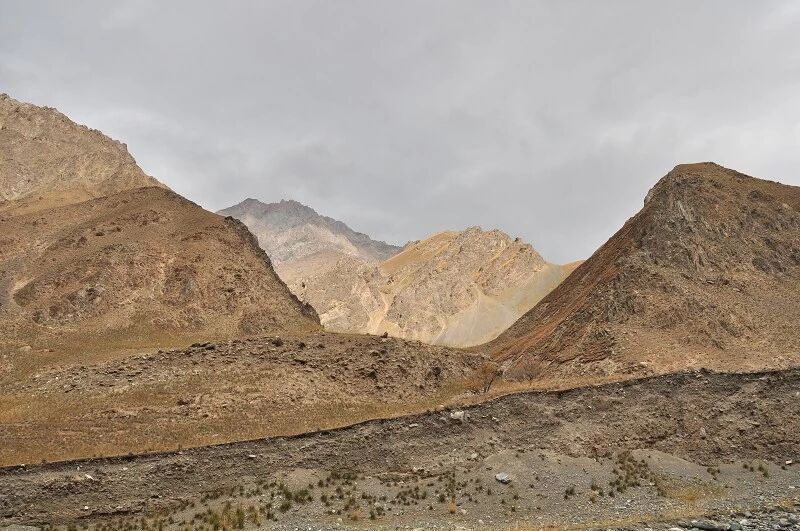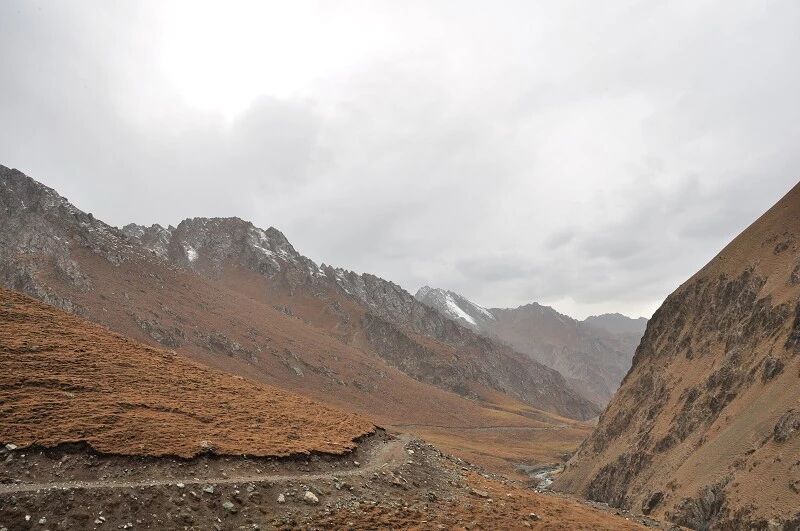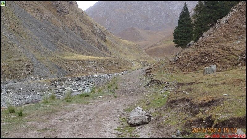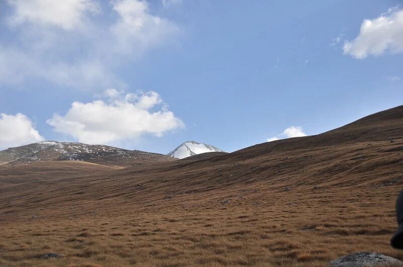 刚开始的两个小时还能到处看到树和绿草地,随着高度不断增高之后树也渐渐见少,草地越来越枯黄,直到连草也看不到多少了,到处是戈壁一样的石块,近处的山光秃秃的十分难看,远处的 山能清淅地看到一片白白的山尖,我知道那是雪,也许那就是我们明天将要翻越的白杨沟达板吧。
