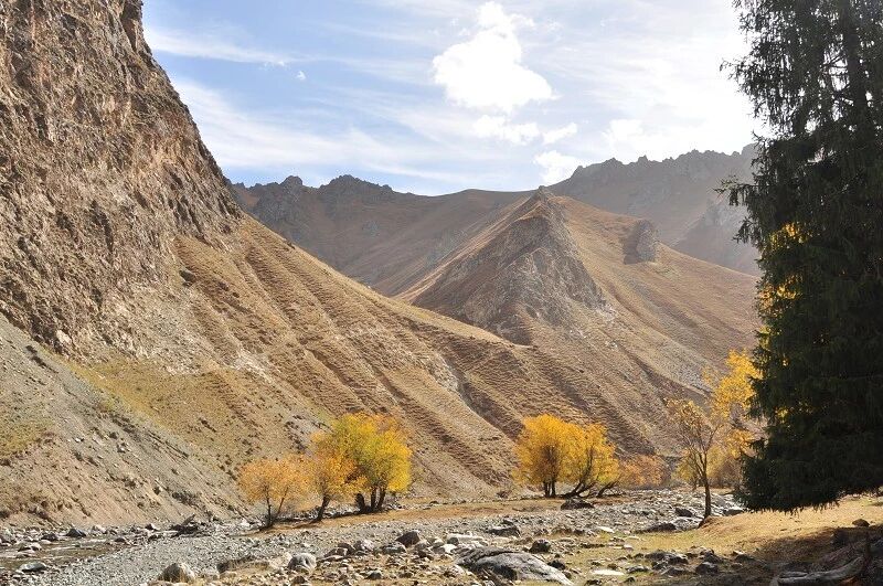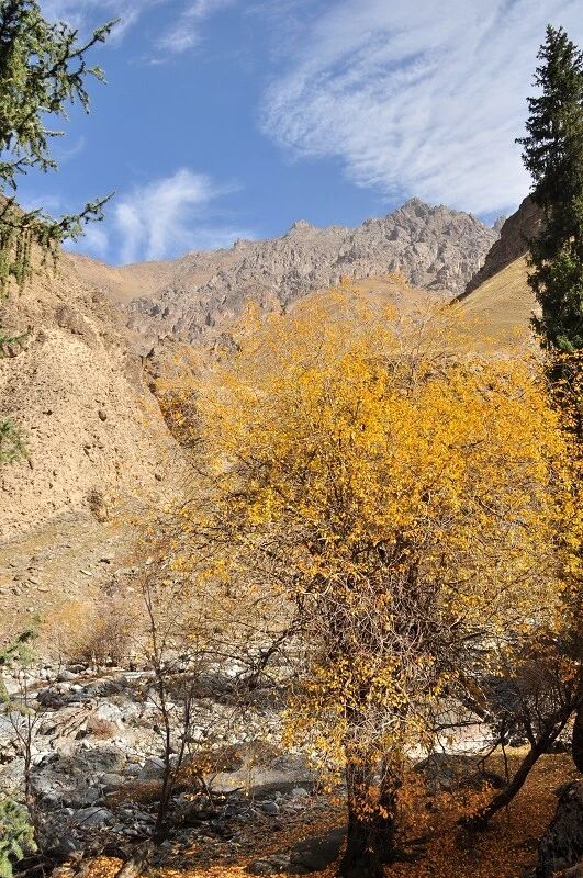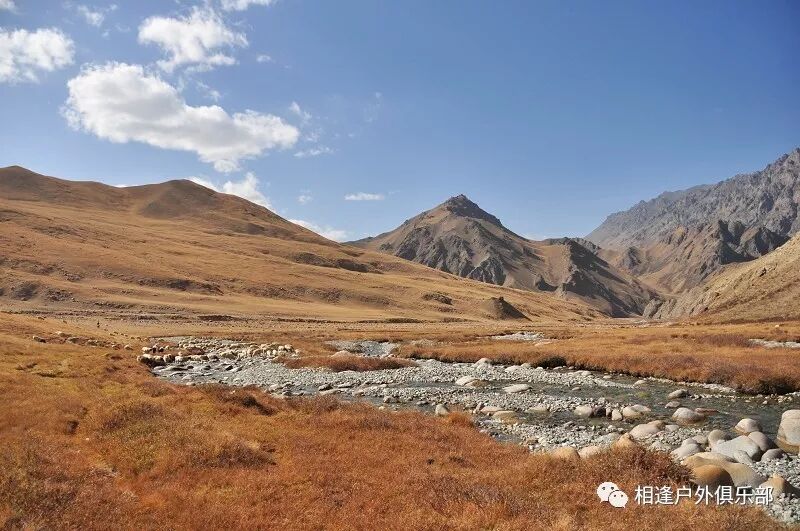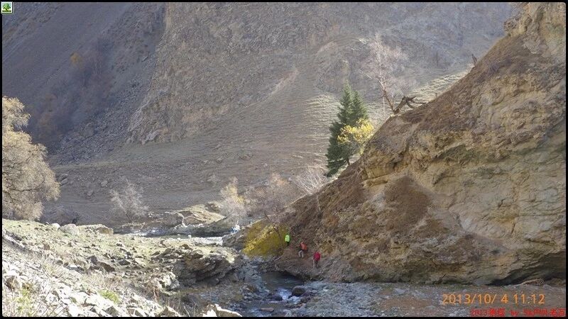 从我们宿营的2750营地到白杨沟达坂底下还有约三个小时的路程。这一段山路起伏不太大,有清晰的马道,一会在河的左岸,一会在河的右岸,需要反复过河,好 在我们去的这个时候已经不是雨季了,白杨河的河水不怎么大,上午半天基本上可以踩着石头过河。