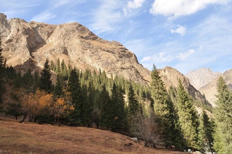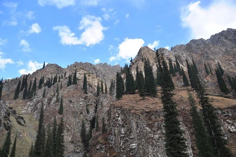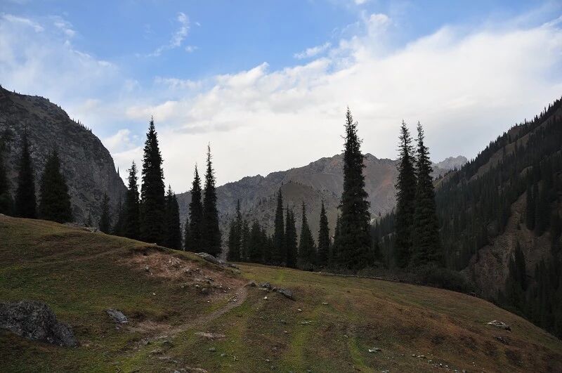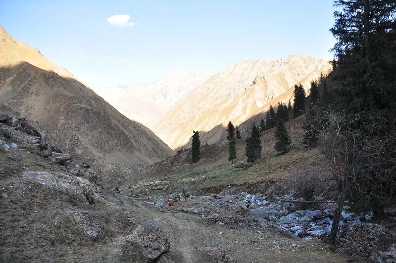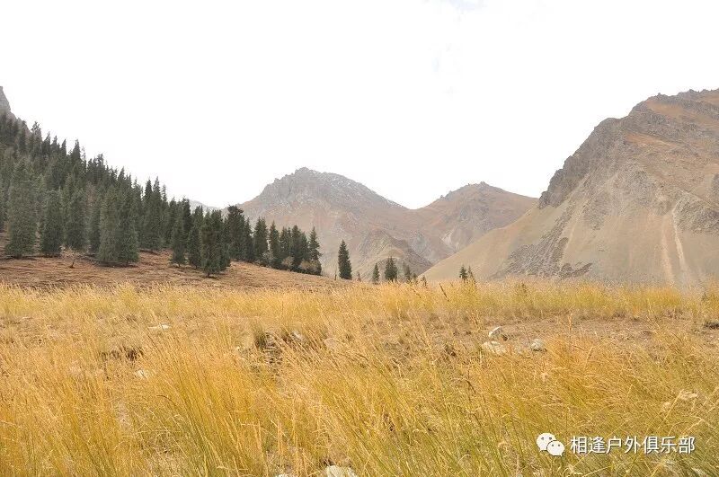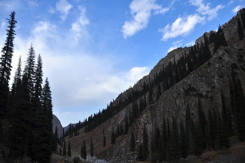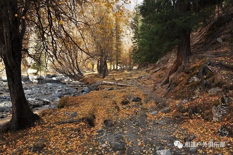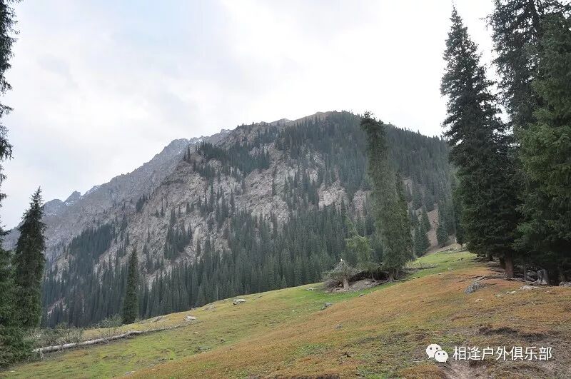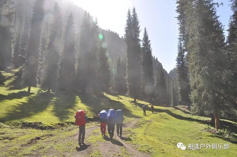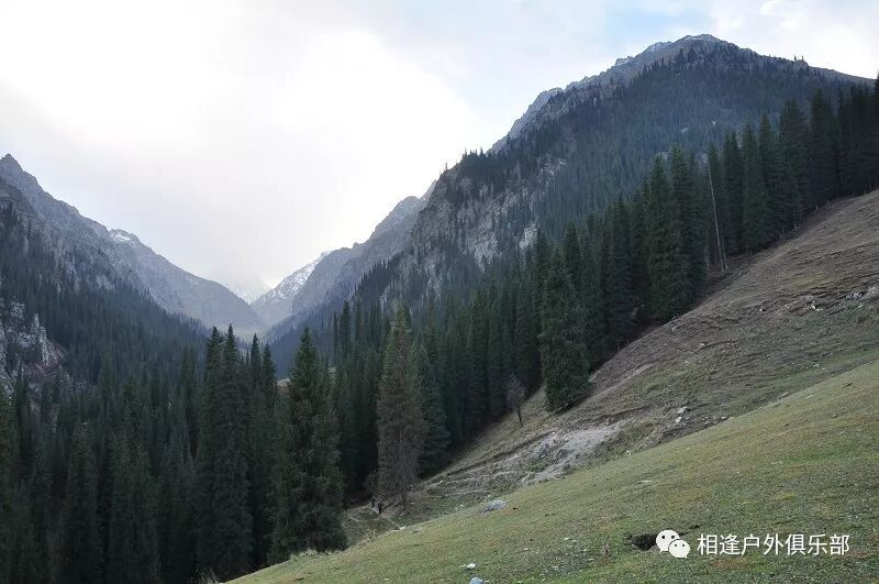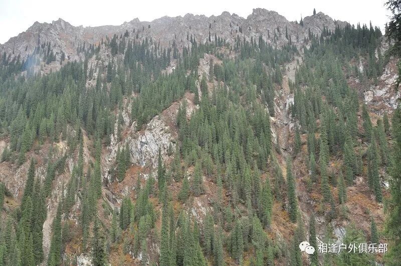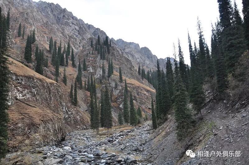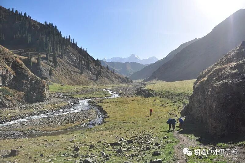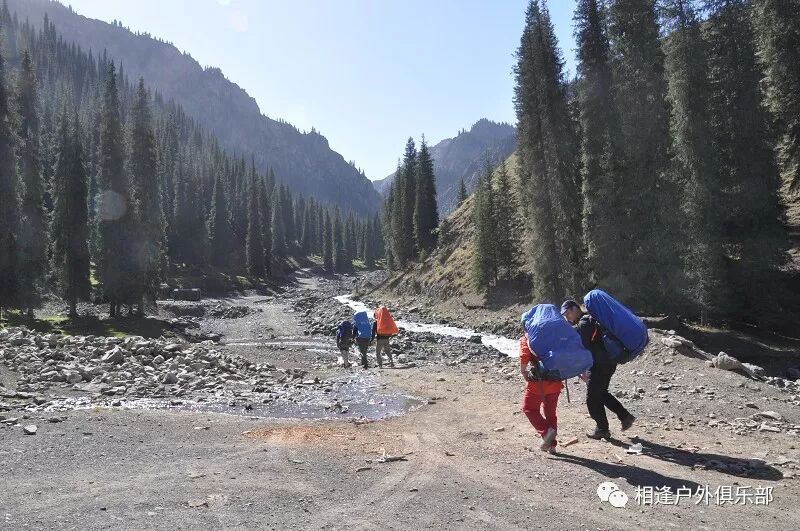 我们徒步开始的位置高度约2000米,地上还是一片绿绿的草地,路左边是三三两两高大的雪岭云杉,右边是白杨河“哗哗”地在不停地流趟,河谷开始也比较宽,天上空当当的,蓝蓝的一片,看不到一丝丝云彩。