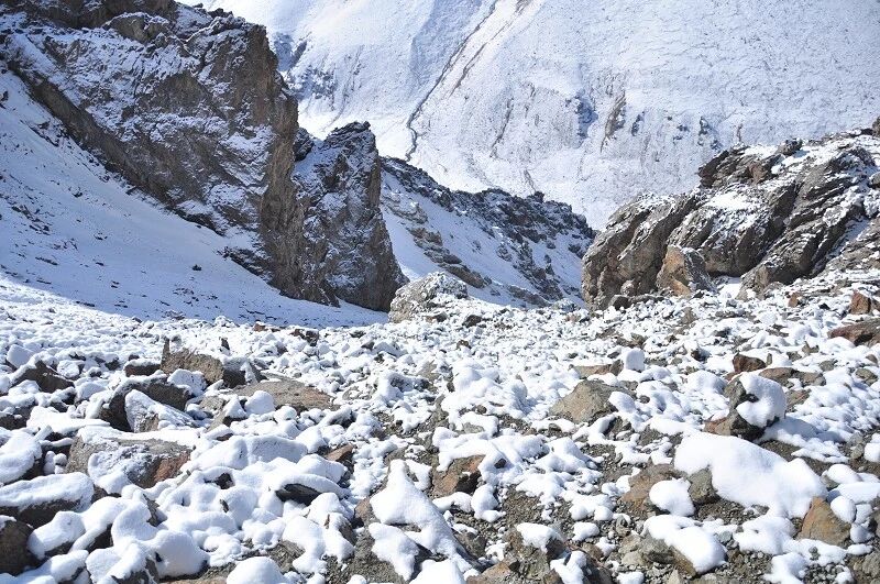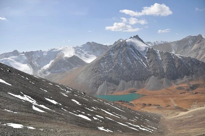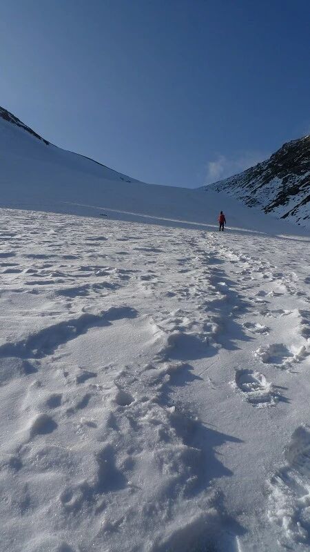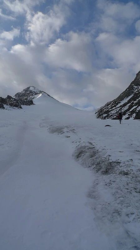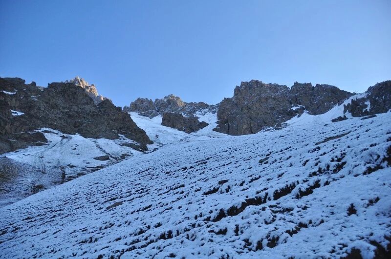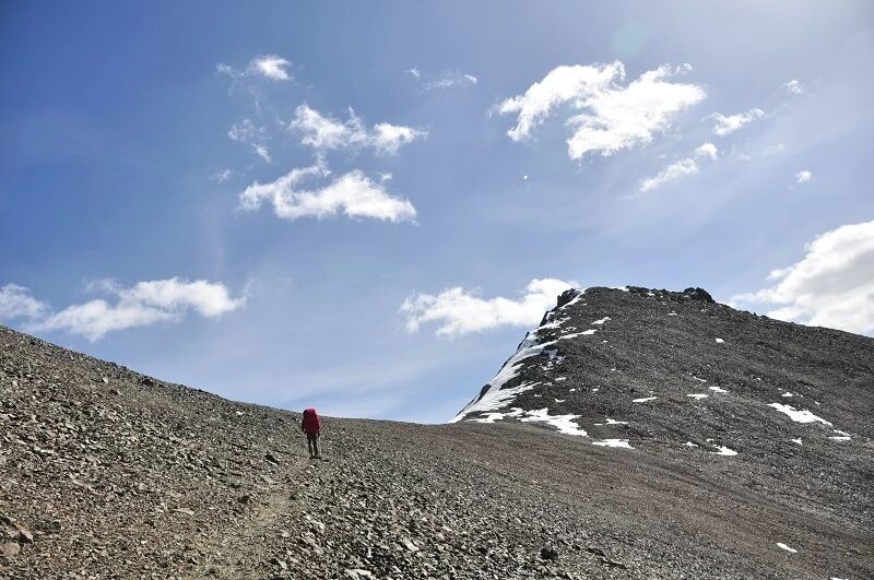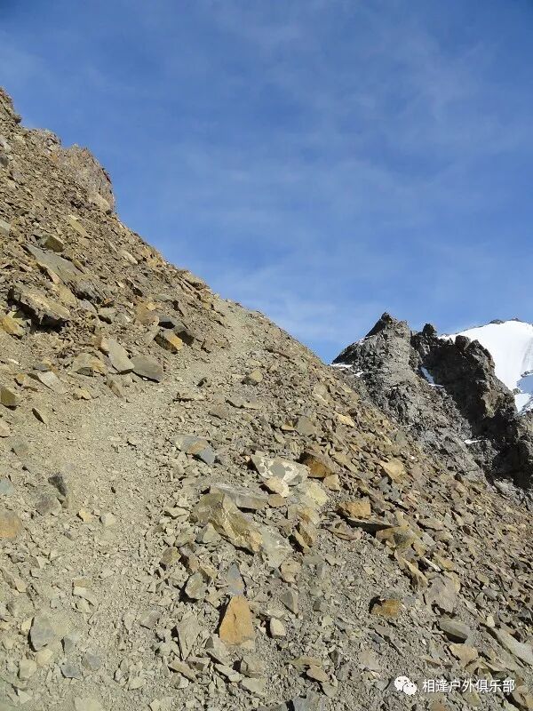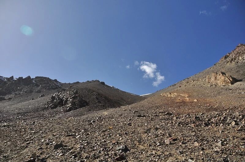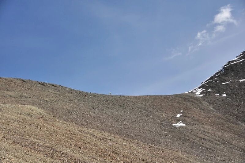 脚下虽然全是乱石堆或是石渣,但是上达坂的马道还是比较 明显的,不用担心找不到路。刚开始马道在右侧,爬升了约半个小时后,过了一片坡度较缓的山路后,马道就变到了左侧。但是还是看不到要翻越的达坂,只能看到右前方(西侧) 的冰川和雪地,雪坡从对面的高山上滑落下来一直伸向下方,在雪地里我还看到了一行不知什么大型动物走过的痕迹,非常清晰,仿佛刚走过去似的。雪坡比较缓,我想,如果靠近城市,这里绝对是一个极好的滑雪场。
