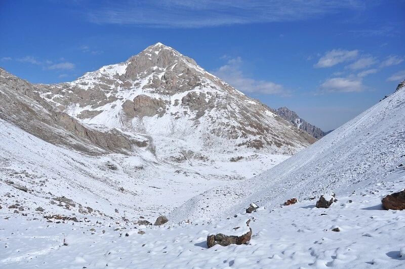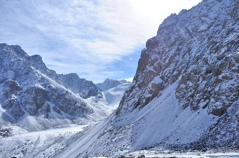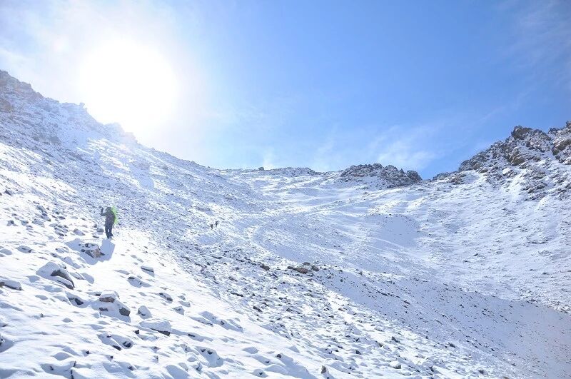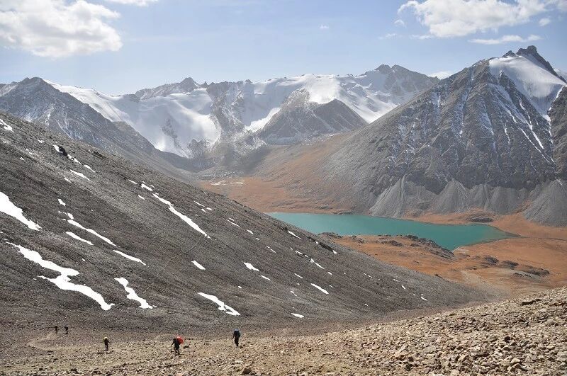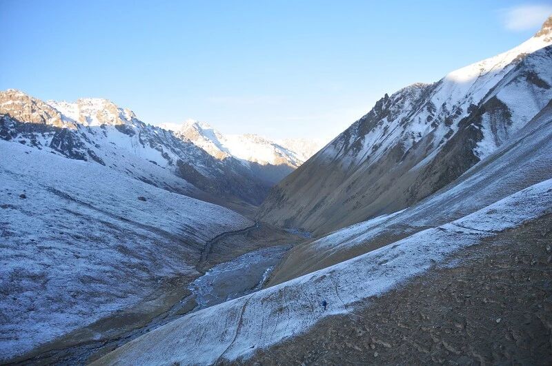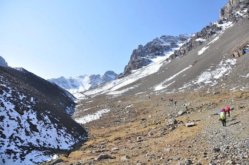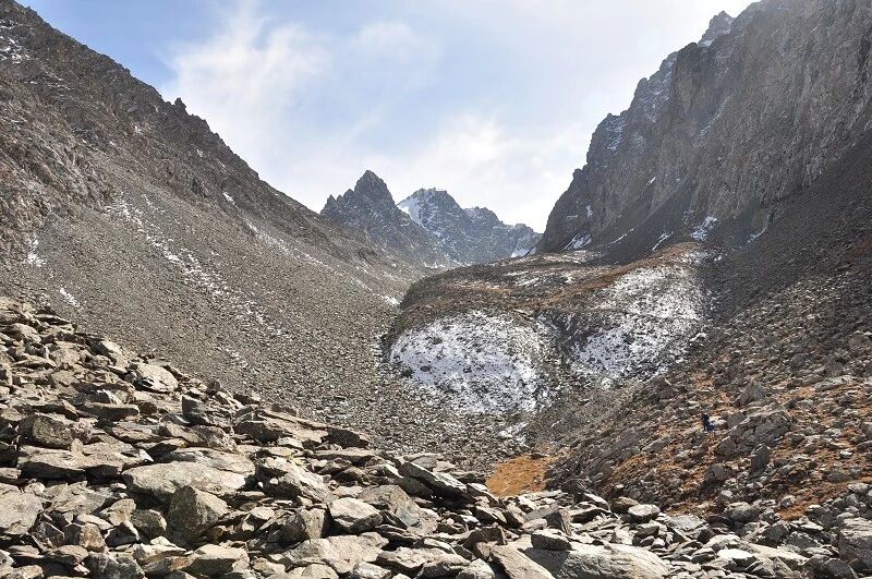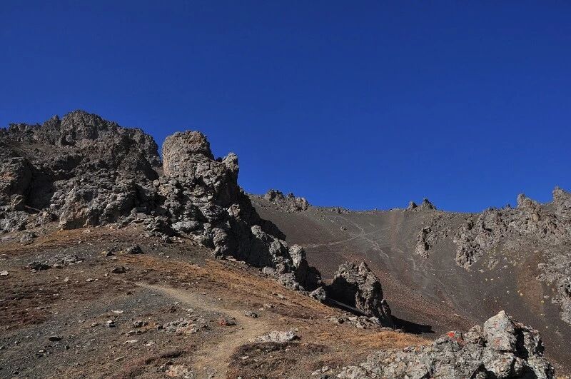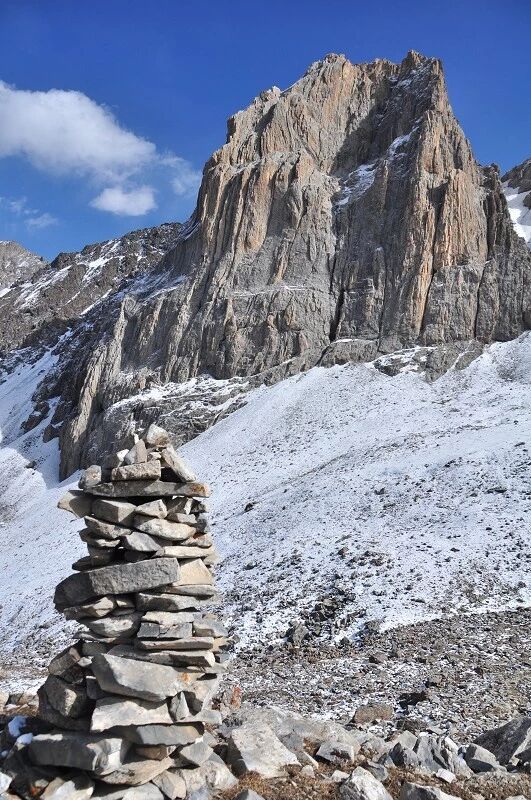 脚下虽然全是乱石堆或是石渣,但是上达坂的马道还是比较 明显的,不用担心找不到路。刚开始马道在右侧,爬升了约半个小时后,过了一片坡度较缓的山路后,马道就变到了左侧。但是还是看不到要翻越的达坂,只能看到右前方(西侧) 的冰川和雪地,雪坡从对面的高山上滑落下来一直伸向下方,在雪地里我还看到了一行不知什么大型动物走过的痕迹,非常清晰,仿佛刚走过去似的。雪坡比较缓,我想,如果靠近城市,这里绝对是一个极好的滑雪场。