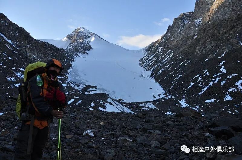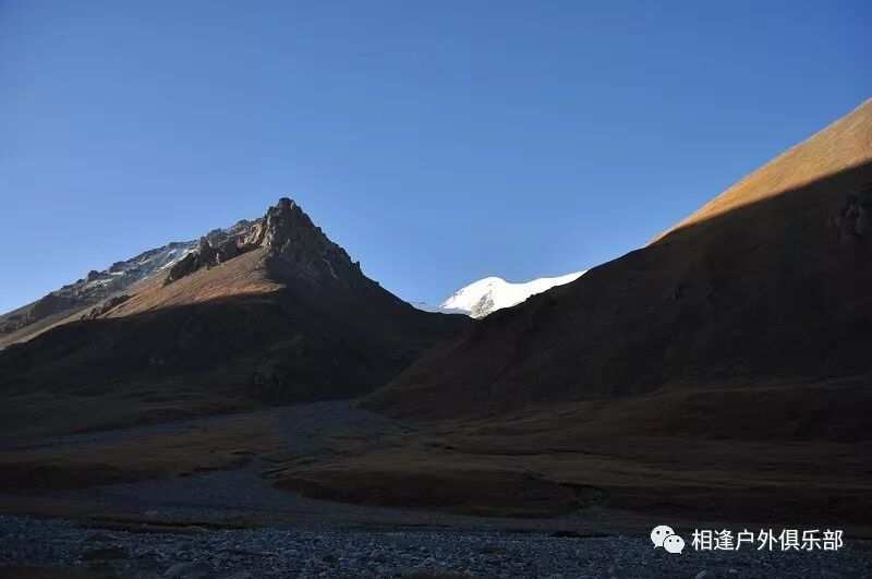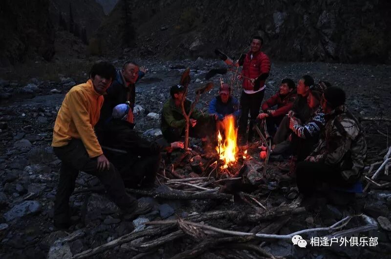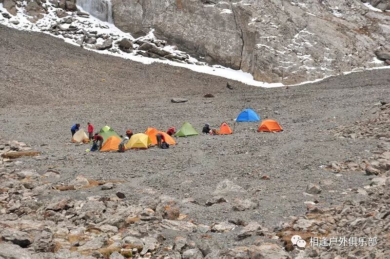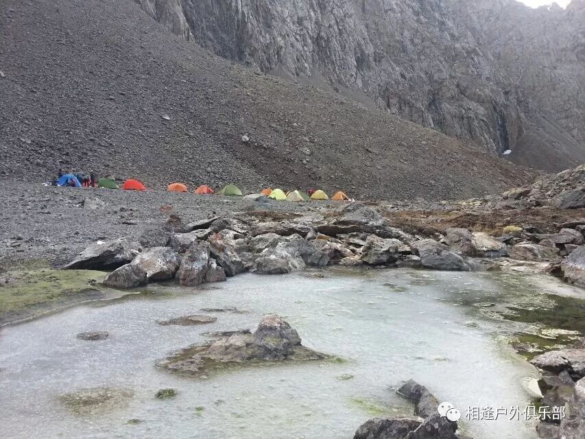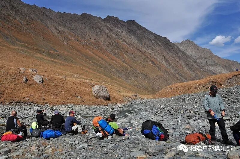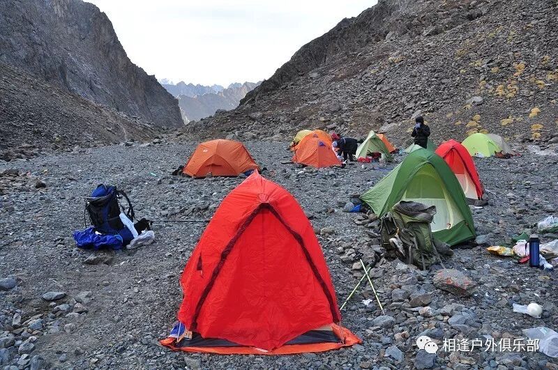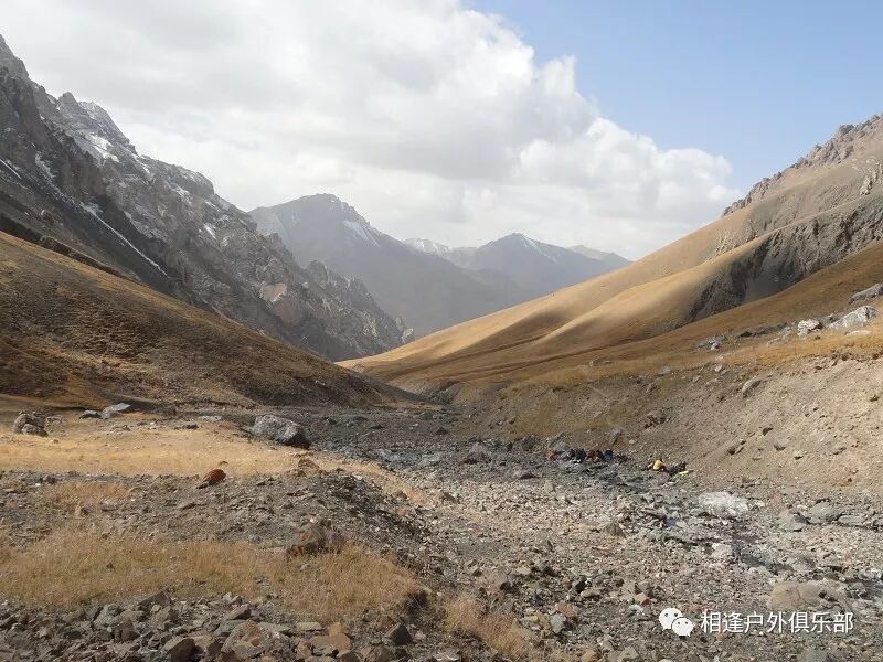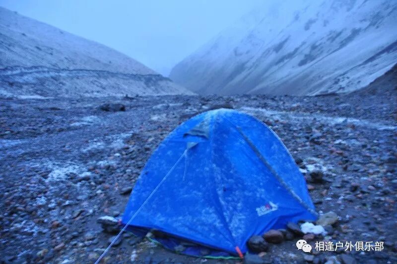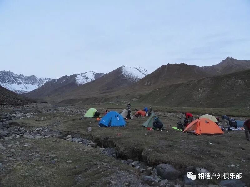 走了5个小时快晚上8点的时候,我们到了一处比较开阔的河谷,左手边好象 还有能通越野车的简易公路,右边的河谷较宽,有一大块高地,流趟的河水离高地不太远有十几米左右,看来是个扎营的好地方,先到的向导背包者及其他人已经到了此处开始放下背包,扎开了帐篷,看到这就是今天计划中的营地了。我们西安三人一起到的,我知道他俩是和我一起,心中感动!最后到的是温州几人,陪大头一起。周围没有一点绿意,向上看只有蓝蓝的天空,远处周围雪山环抱。这是我们第一天的营地,高程约2800米,就叫做“2800白杨河谷营地”吧。
