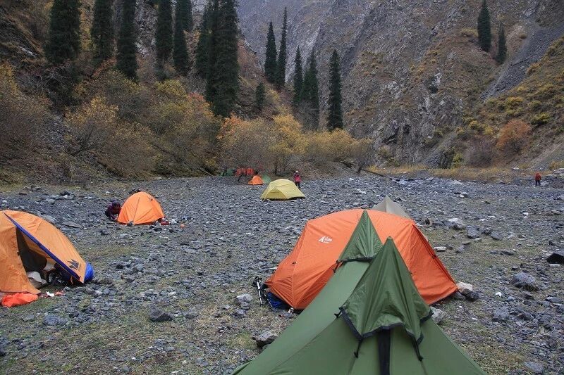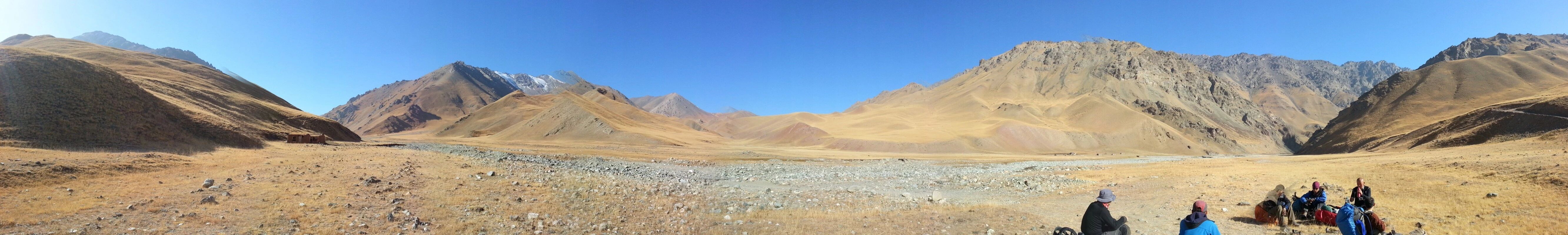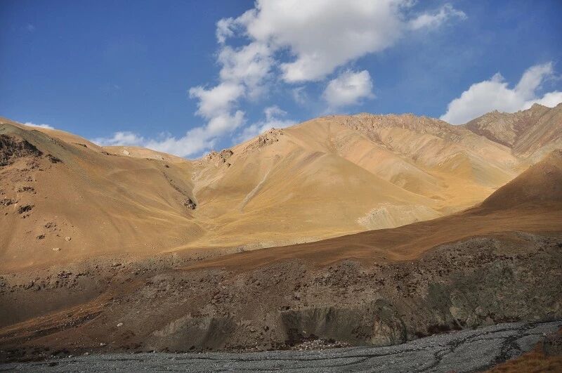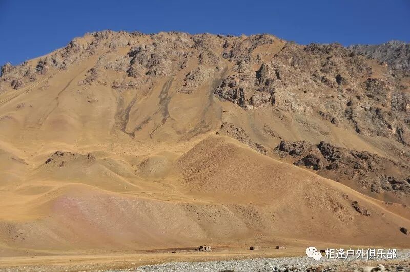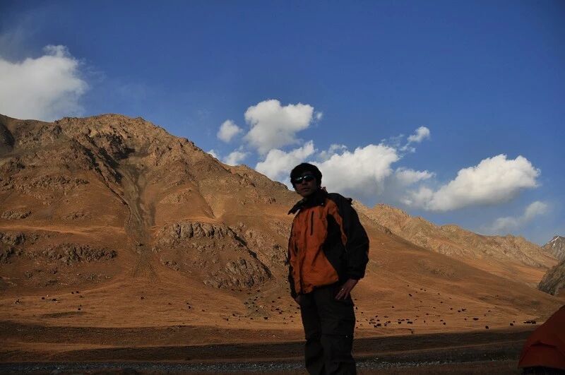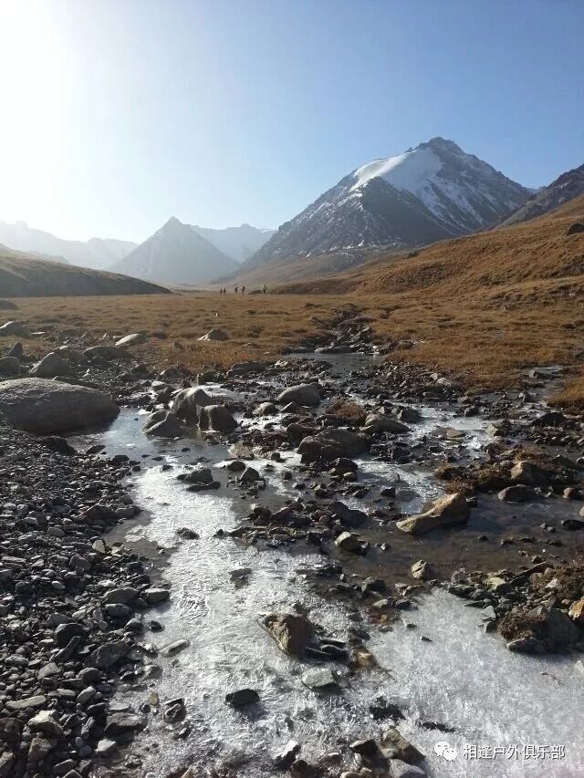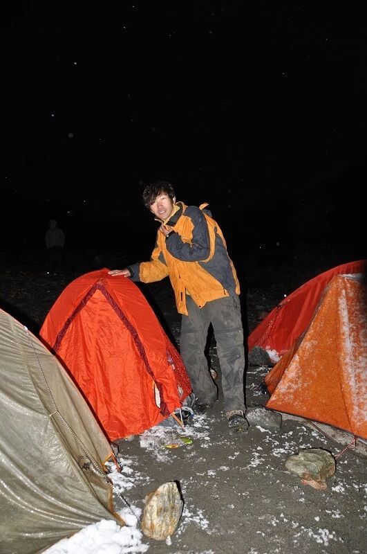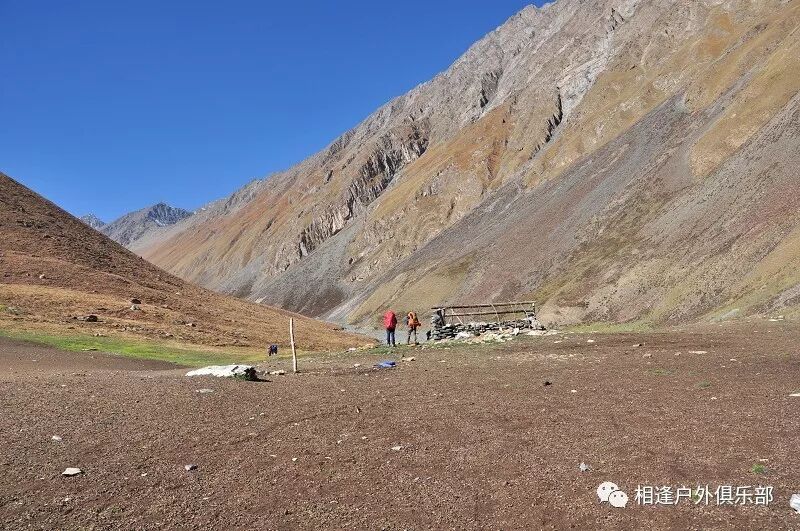 走了5个小时快晚上8点的时候,我们到了一处比较开阔的河谷,左手边好象 还有能通越野车的简易公路,右边的河谷较宽,有一大块高地,流趟的河水离高地不太远有十几米左右,看来是个扎营的好地方,先到的向导背包者及其他人已经到了此处开始放下背包,扎开了帐篷,看到这就是今天计划中的营地了。我们西安三人一起到的,我知道他俩是和我一起,心中感动!最后到的是温州几人,陪大头一起。周围没有一点绿意,向上看只有蓝蓝的天空,远处周围雪山环抱。这是我们第一天的营地,高程约2800米,就叫做“2800白杨河谷营地”吧。