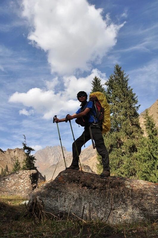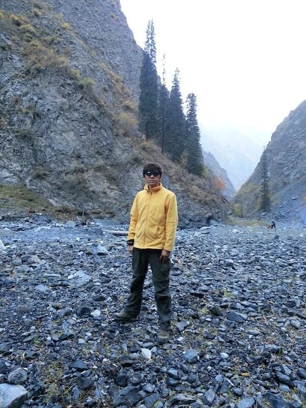 走了三个小时的时候我们看到了进山的第一个象绿皮车篷子一样的一个简易帐篷,估计是夏日牧民们休息用的,没有人。又向前走了不远,看到有一个两间房大小的绿帆布帐篷,南面有一堆煤,上面的烟筒还冐着烟,帐篷前有一个人。我们聊了下原来是搞勘探的,尽然和我一个系统的,哈哈。他们进山是搞事业,我进山是搞爱好、、、怎么地吧???继续前行我们碰到一个手提一双徒步鞋,背着大包,低着头迎面向我们走来的二十七八岁的年轻人,,知道他是早我们几天进山因膝盖疼痛而退出狼塔穿越活动的上一个队伍的队员。我们聊了下,我告诉他前面就有人住的帐篷,你今晚可以在那扎营。他一再劝我们,要减负啊,一定要减负、、、望着他低头远去的背影,我不知道 他当时在想什么 ,而我当时想的是过两天后,我们这一队的14个人其中的一个会不会也象他一样就这样无缘狼塔穿越活动而退出,独自一人孤独地选择离开呢?我相信即使是有,那个人也一定不会是我。