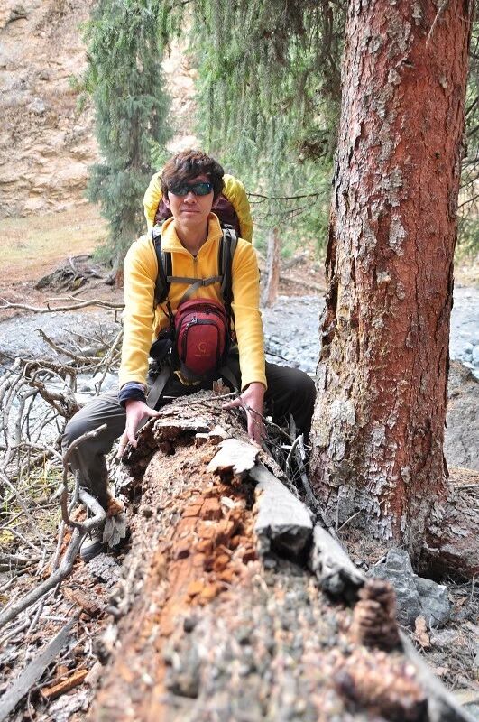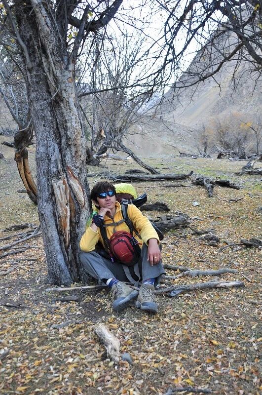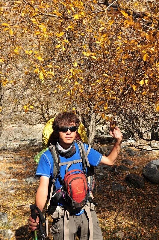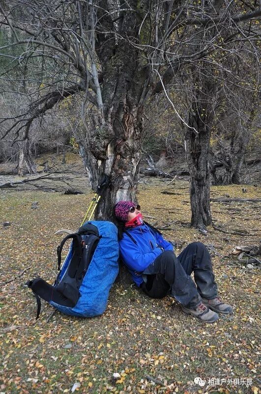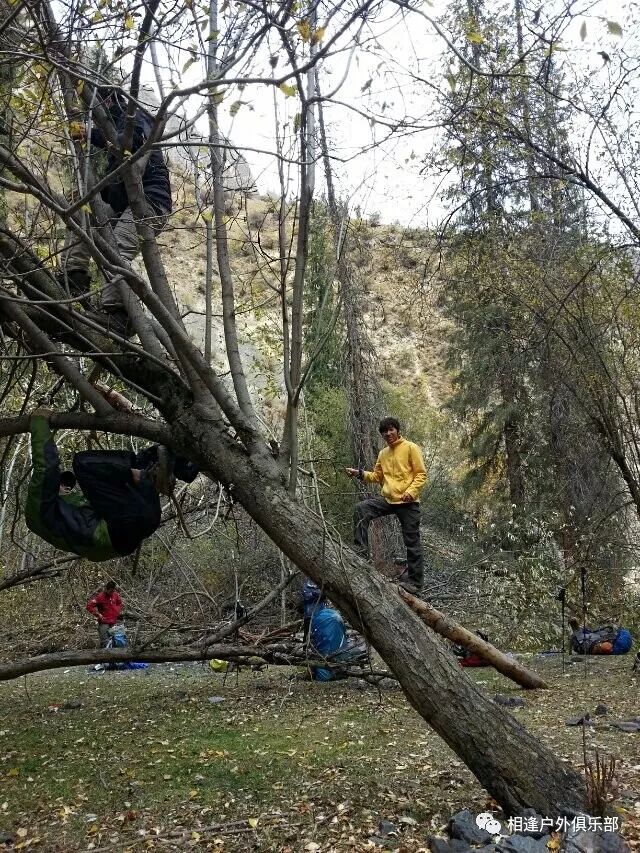 在一棵大树下临时休息的时候,向导“背包者”再一次向我们提出了考核体能要求,并规定了淘汰计划。(其实前一天晚上在宾馆的时候已经向我们讲述了考核要求)那就是我们明天下午北京时间3点之前都必须到达白杨沟达板的最高处(3860米),如果谁要是达不到这个目标,或是离这个目标相差太远,第二天就地淘汰,自动退出穿越队伍,自行返回。其实对于考核规定的这个目标我是一点也不害怕的,因为我知道从此地到白杨沟达板的直线距离也就20公里左右,今天下午3点到明天下午3点一共爬升约1800米,我自认为跟自己平时的爬山相比较还是满有把握的,不知道别人是怎么想的,反正我就是觉得问题不大。一直在中后不紧不慢地走着,按着自己的节奏、、、
