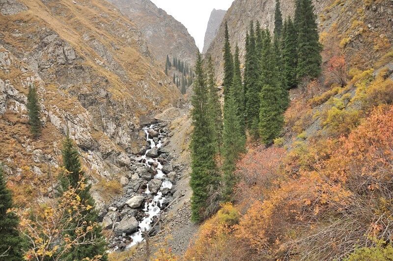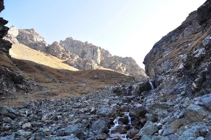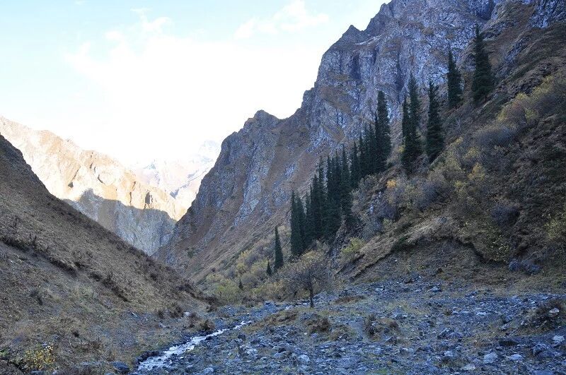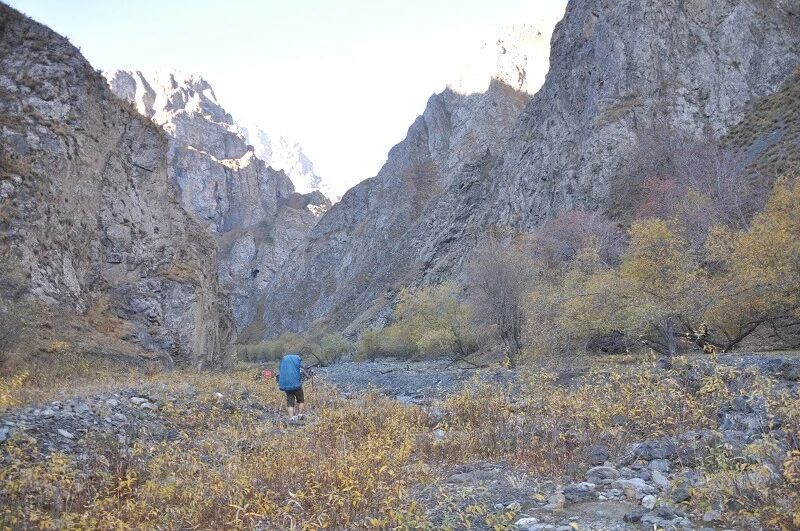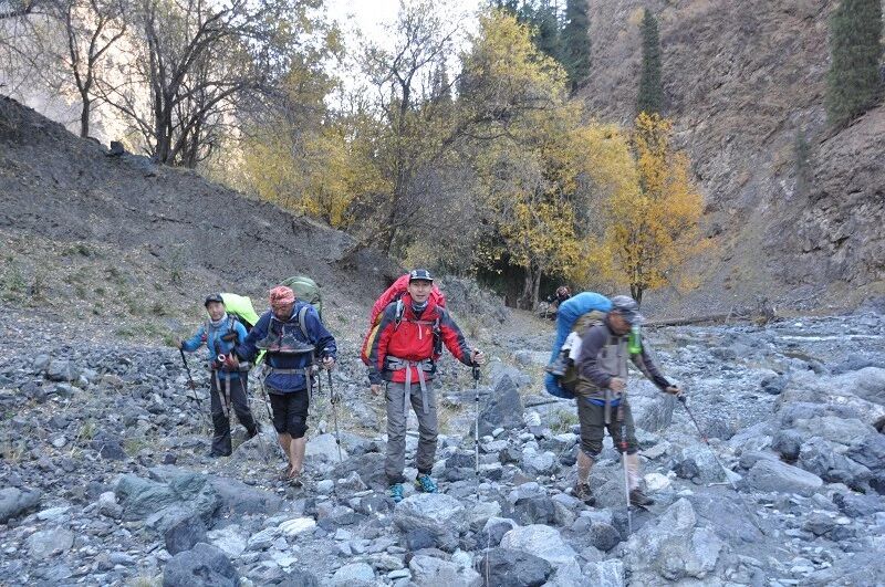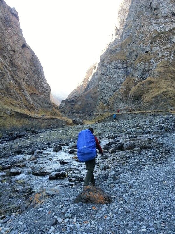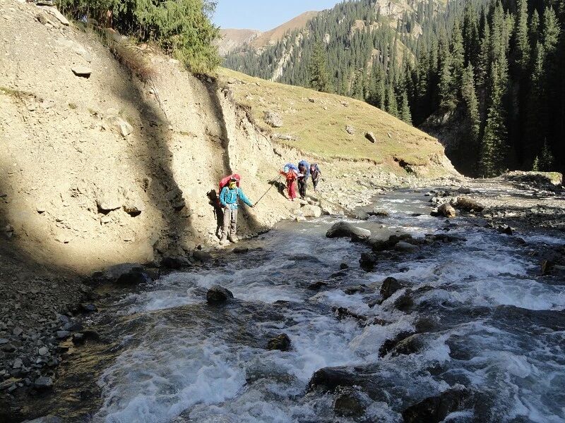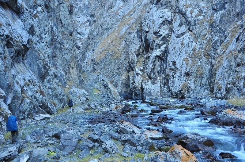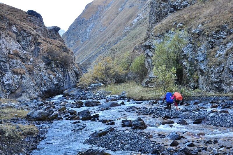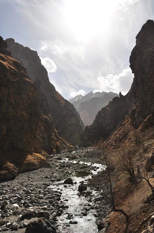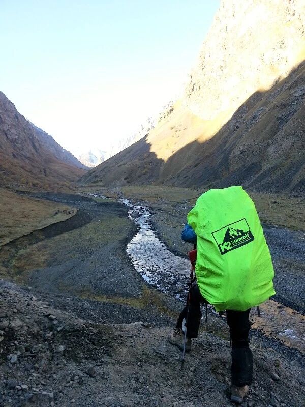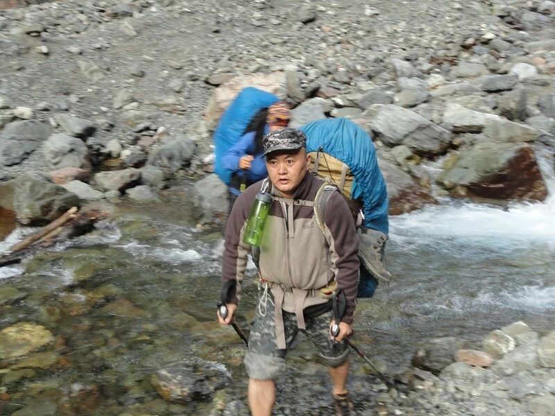 我们基本上一路一直在上升,但上升的坡度不是很大,只知道从刚开始不久就开始不停地过河。我庆幸我们来的时候已经快到了国庆节,过了汛期,山中少雨,加上温度也低多了,山上化掉的雪水也少了,所以河水不太大,水流也不急,我们第一个半天的过河基本上都是都可以踩着石头过去的,不用 换鞋。