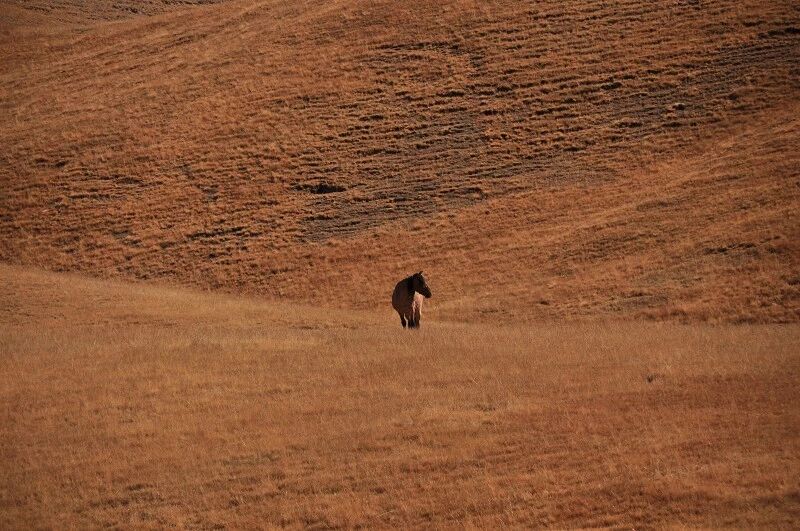 对面的马儿在自由自在的吃草