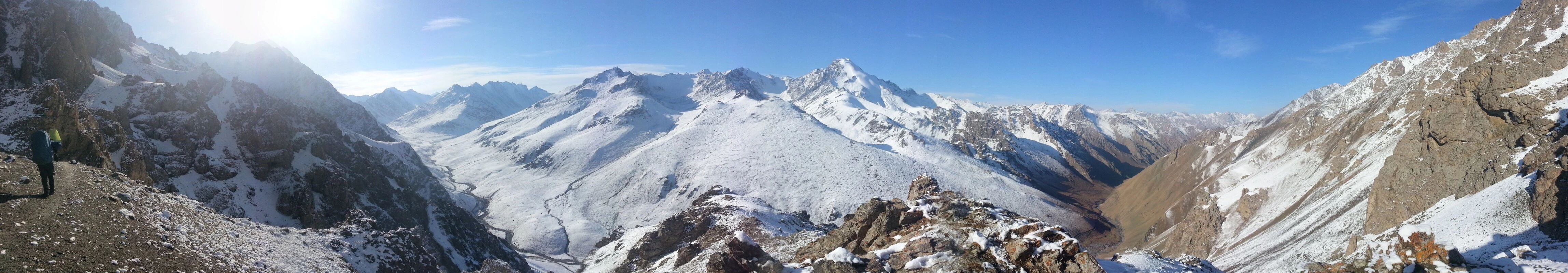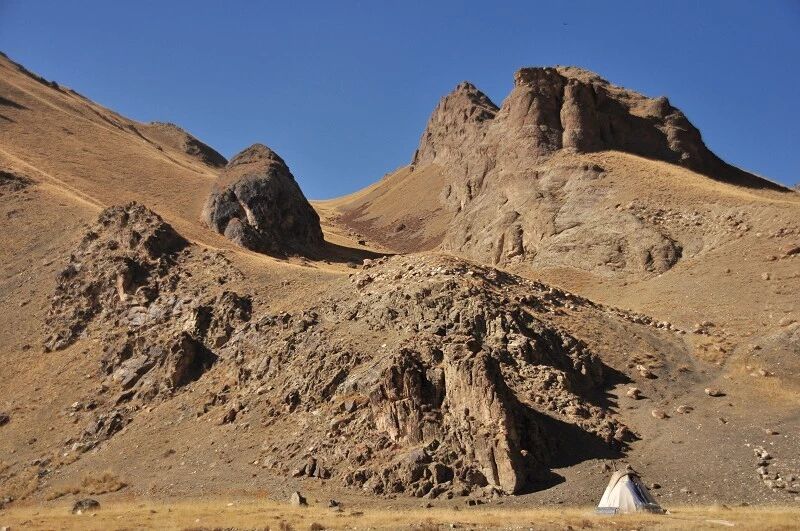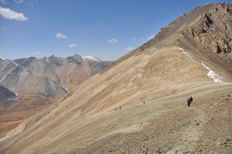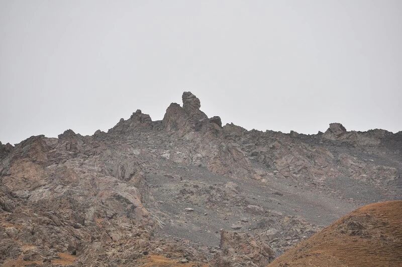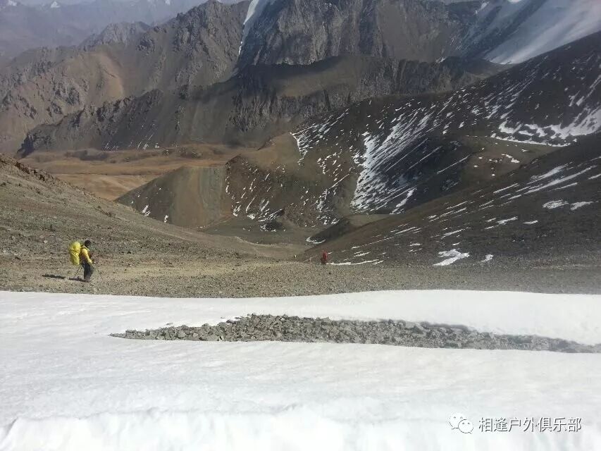 这是我们第一天的营地,基本上已经没有了树和草地,周围的山体都是光秃秃的,远处山的阴坡上到处是未化的积雪,从这里可以看出来,我们基本是向南的方向前进的。