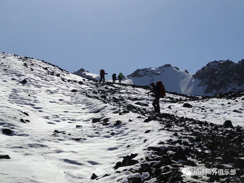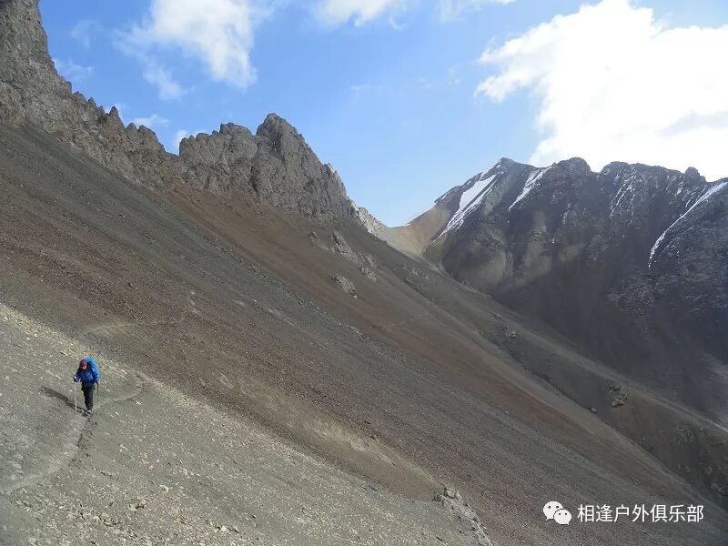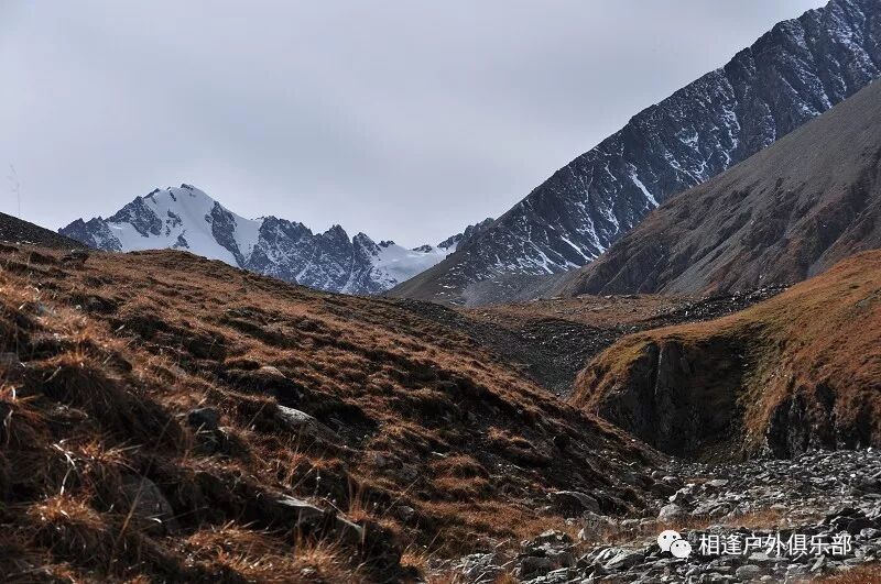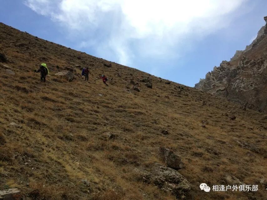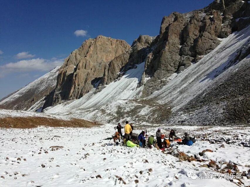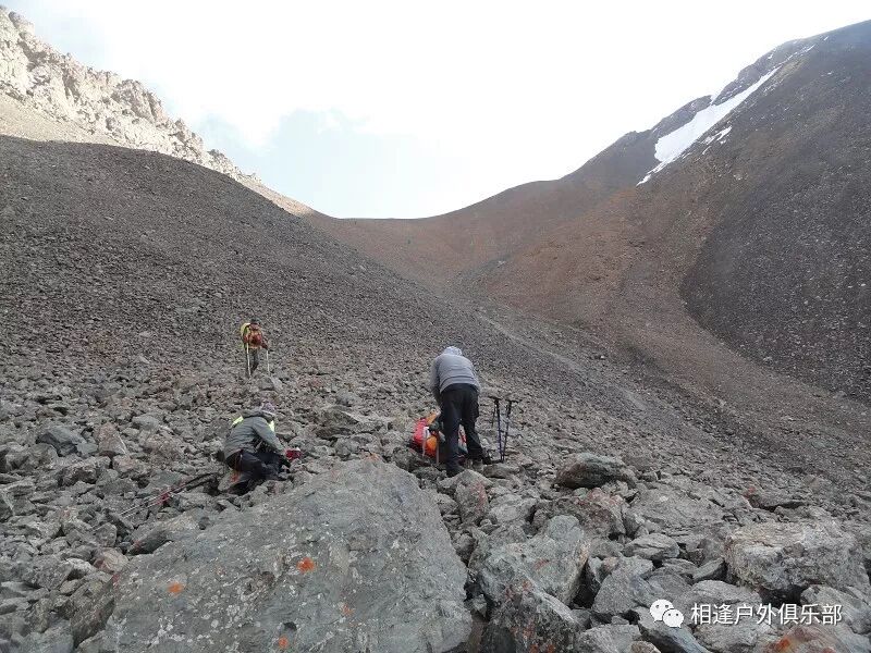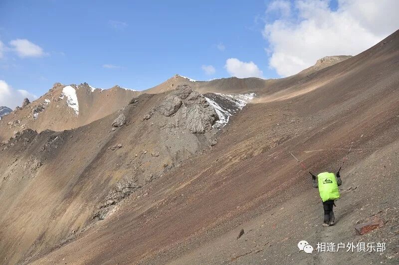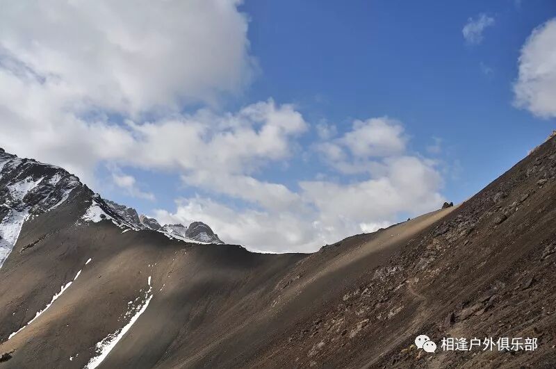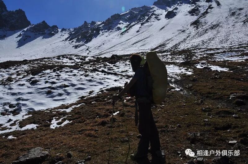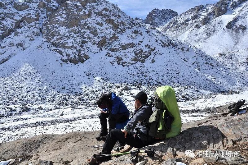 我们总共大概走了三个多小时就到白杨达坂底下,这时能够看到白杨沟达坂右侧的雪山,但是还看不到要翻越的垭口,领队卸下他的背包说让我们休息一班半小时并午餐,吃好休息好了,再翻达坂。