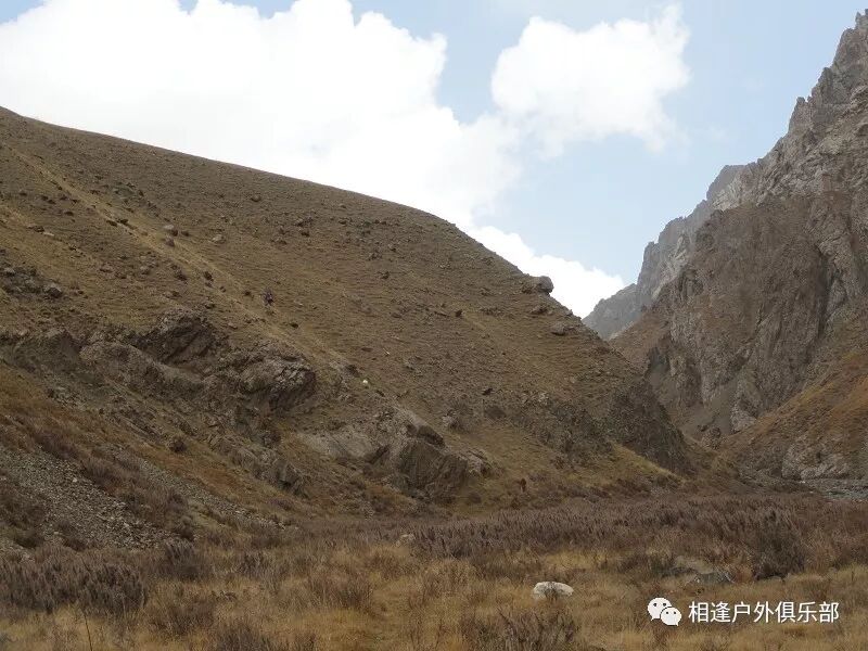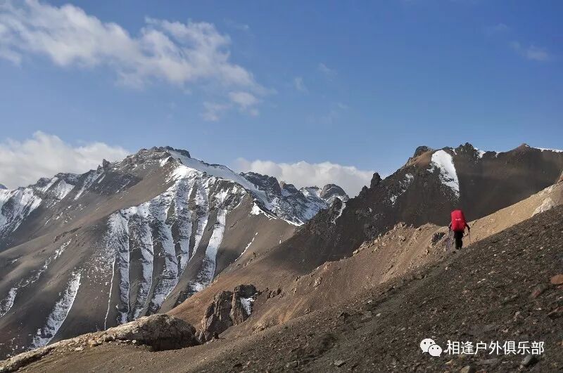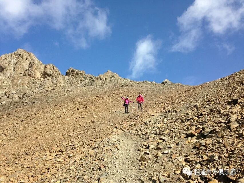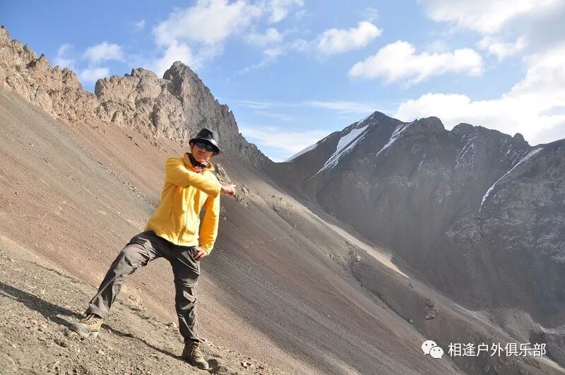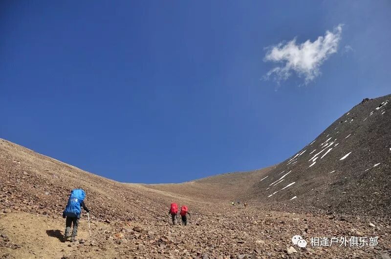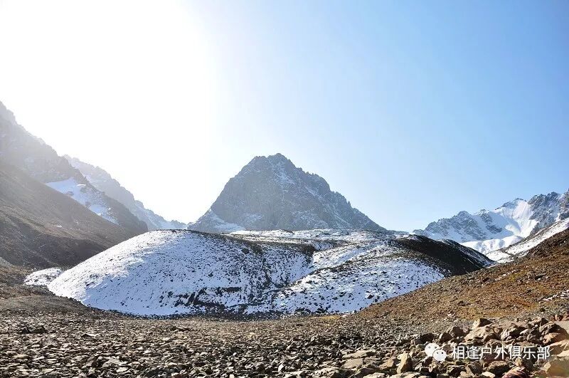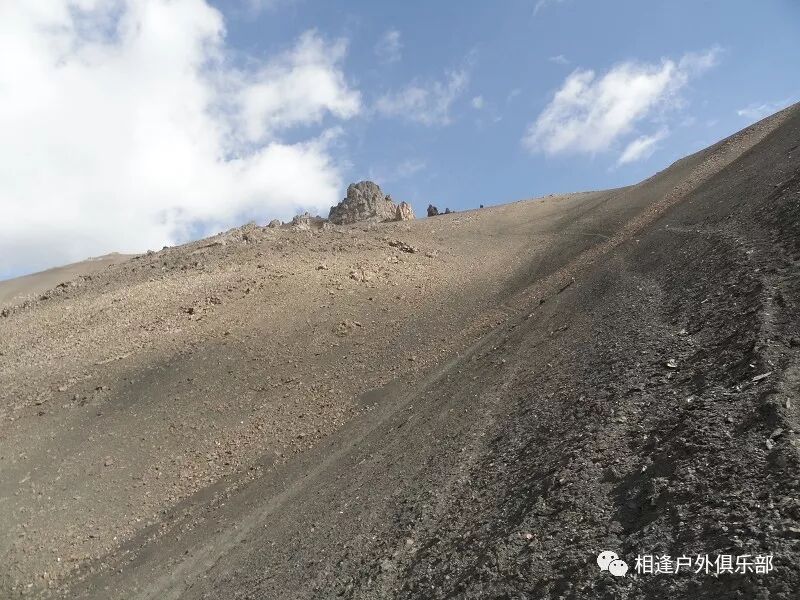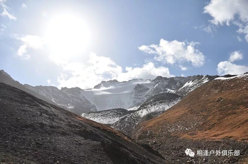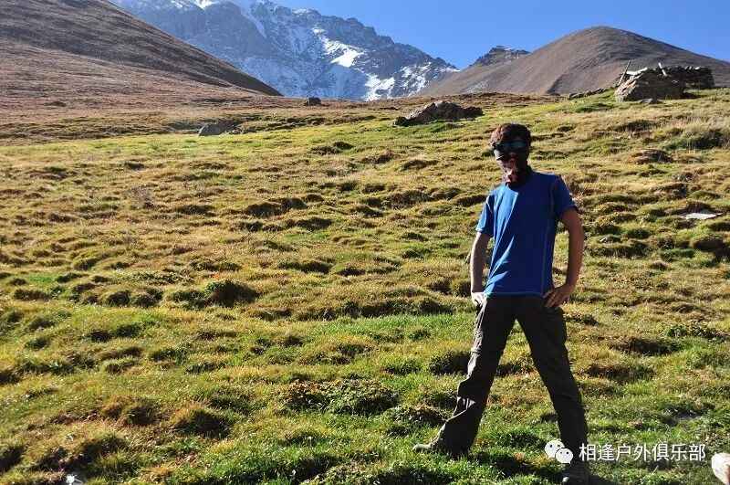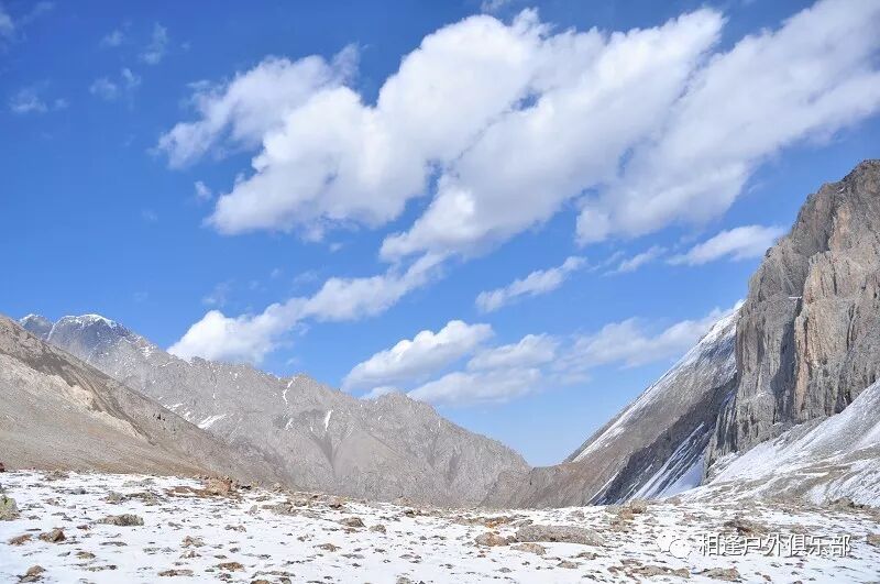 我们总共大概走了三个多小时就到白杨达坂底下,这时能够看到白杨沟达坂右侧的雪山,但是还看不到要翻越的垭口,领队卸下他的背包说让我们休息一班半小时并午餐,吃好休息好了,再翻达坂。