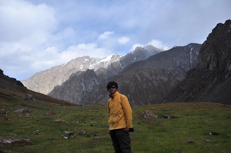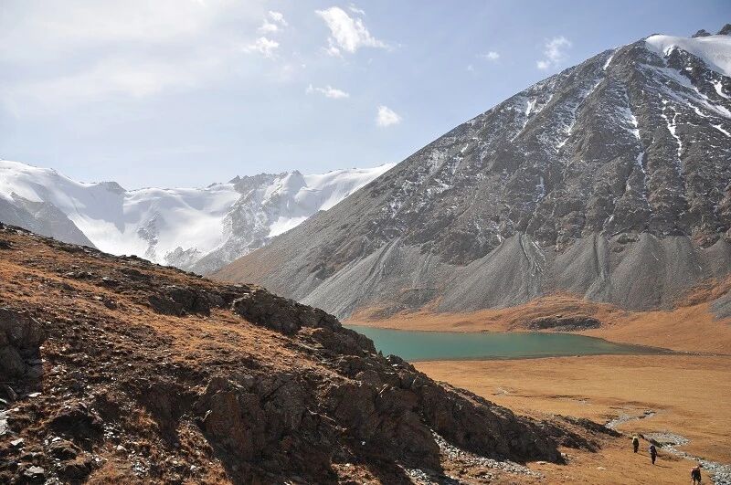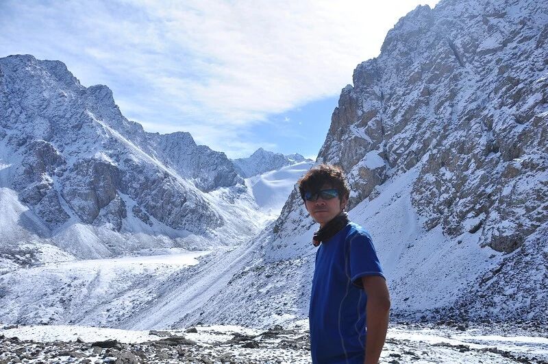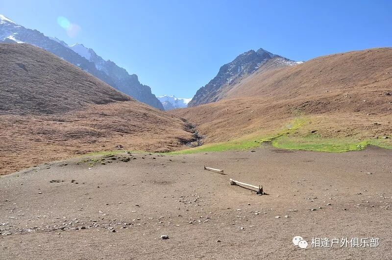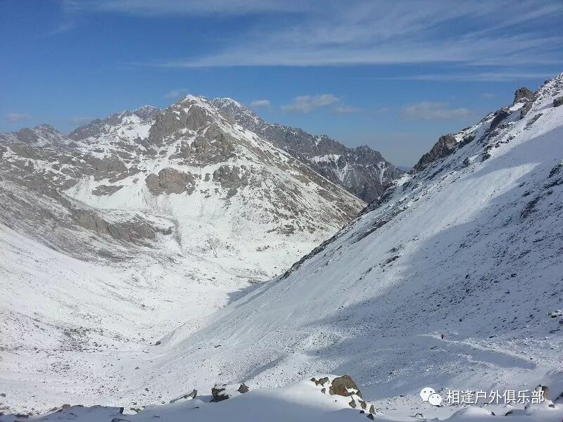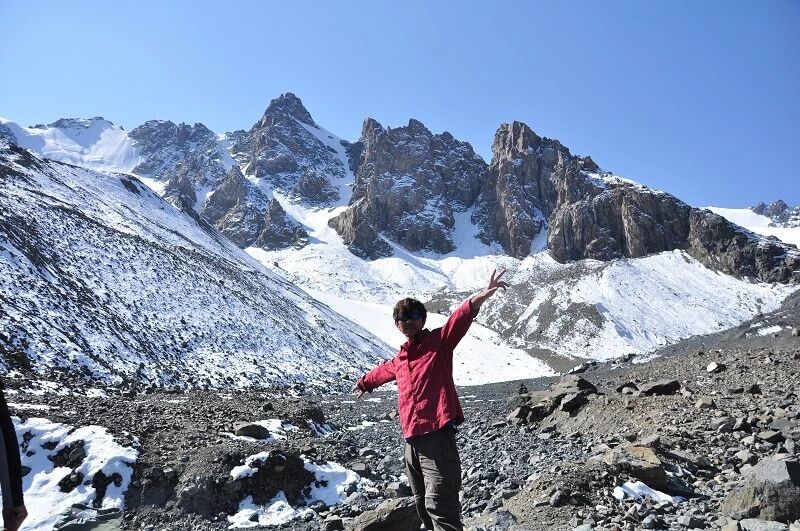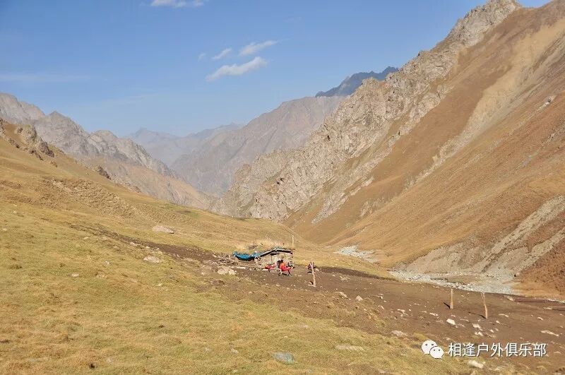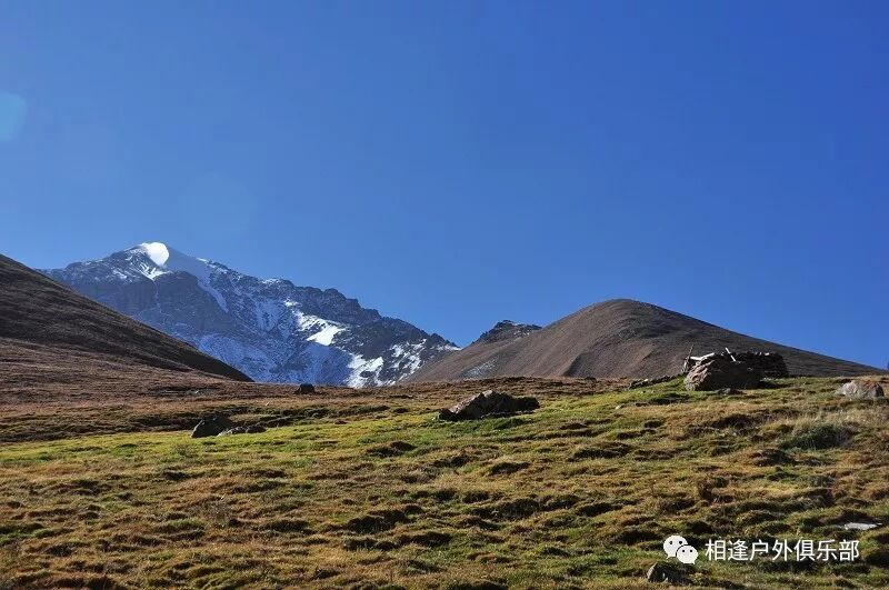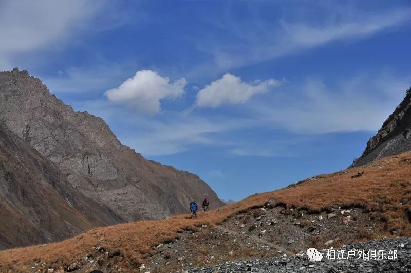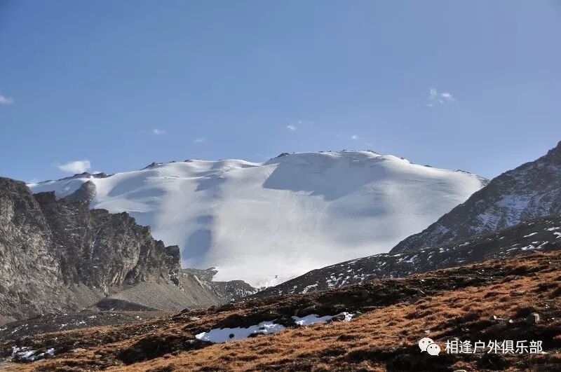 我们总共大概走了三个多小时就到白杨达坂底下,这时能够看到白杨沟达坂右侧的雪山,但是还看不到要翻越的垭口,领队卸下他的背包说让我们休息一班半小时并午餐,吃好休息好了,再翻达坂。