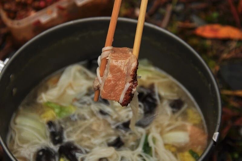 中午12点整开始午餐时间。我们没有开火,只吃了一些零食,小黄瓜、能量棒(我们3 人每人准备一天一个)没食欲。景石大哥拿出了白萝卜,我们生吃有点辣、我就叫景石哥别背了扔了吧、风景哥说煮熟不辣,还想让背的意思、我和景石的意思一样,最后还是扔掉了。景石哥把他心爱的二斤白酒敬了山神。我支持他减负!他们大都开火做饭。