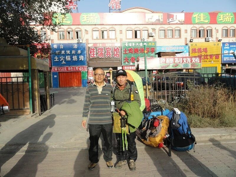 出发前在入住的宾馆门前‘梦游大哥’与当地知名驴友兼领队“树”合影。