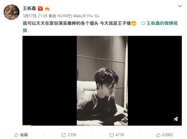 婚礼当天,王栎鑫发微博写道:“2015年2月2号,我人生当中最重要的时刻。我很感激,也很开心,站在我对面的人是你,吴雅婷。”