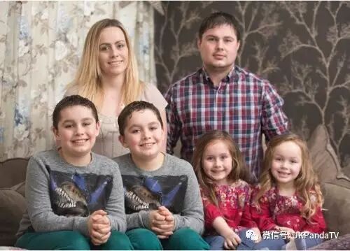 据报道,来自英国约克的 Emma 在大学时就遇见了 John。虽然她一直服用避孕药,但 19 岁时她突然发现自己怀孕了。Emma 说:" 当时真是大吃一惊,我内心其实是崩溃的。之前我每天都服用避孕药,所以我不敢相信自己会怀上孩子。我去照超声波照片时,医生说能看到两个胚胎。" 图为 Emma 一家。