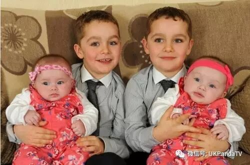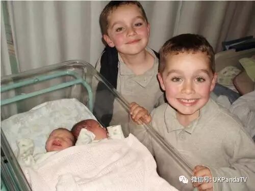 当 Emma 生下 Connor 和 Kyle 双胞兄弟后,医生把避孕剂植入她的手臂(避孕剂内的激素通过硅橡胶上的微小细孔,每天以恒定的剂量释放进血液发挥作用)。而医生说这种避孕方法 99% 的情况下都有效。但是 Emma 还是 " 中奖 " 了,又怀上一对双胞胎。图为双胞胎姐妹刚来到人世,Connor 和 Kyle 去医院看望妹妹们。