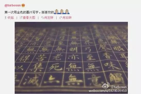 再回到孙俪,娘娘之前在微博上还秀了一下自己用金色墨汁写的字,这高大上的感觉,大家来感受下↓