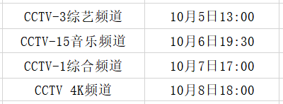 该节目将于10月5日中午13:00央视综艺频道(CCTV-3)、10月6日晚19:30央视音乐频道(CCTV-15)、10月7日晚17: 00央视综合频道(CCTV-1 )和10月8日18:00央视4K频道播出。