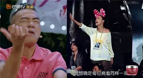 然后镜头立刻切到了陈小春,陈小春迅速模仿了应采儿的举动,站起来,高唱,又比着心。
