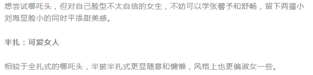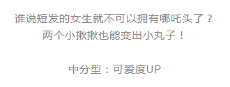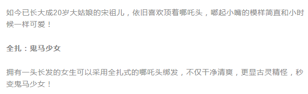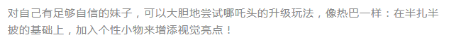 对短发的女生来说,全扎可能难度较大,像娜扎一样采用半扎式哪吒头就可以做到甜美中不失小个性。