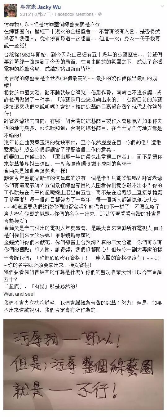 吴宗宪在网上写下近千字留言,称“污辱我──可以!但是,污辱整个综艺圈就是──不行!”他表示,韩国、中国内地的一些综艺节目,预算高出台湾地区节目数十倍,那些认为韩国综艺赢过台湾的人,显得相当外行。同时,相当敢“喷”的吴宗宪还指出评委的工作只是选出谁是当年最杰出的电视工作者,而不是对艺能界说三道四,一副高瞻远瞩、恨铁不成钢的姿态。