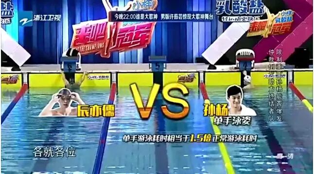 第三个50米,单手游泳的孙杨轻松胜过辰亦儒,单手游泳耗时相当于正常游的1.5倍。他还是轻松领先10秒。