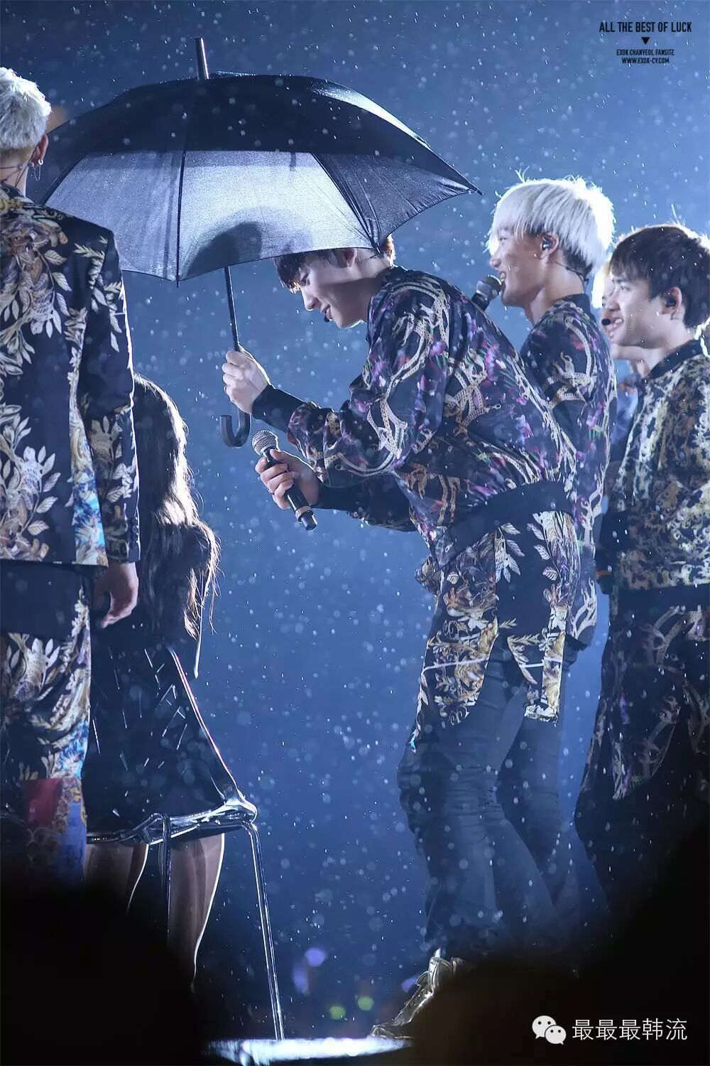 在演唱会上,朴灿烈会弯下腰给歌迷打伞↓