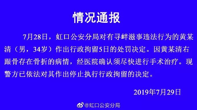 7月28日,黄毅清因寻衅滋事违法行为被行政拘留5日的消息引发关注。不过,今早(29日)9:15,上海市公安局虹口分局官方微博再发通报称,因黄某清右跟骨存在骨折的病情,经医院确认须尽快进行手术治疗。现警方已依法对其作出停止执行行政拘留的决定。