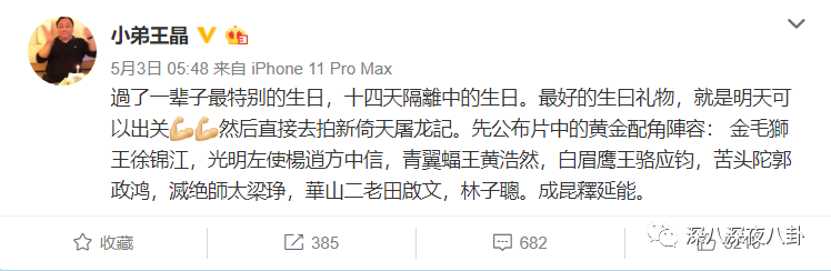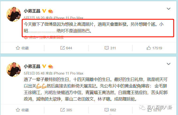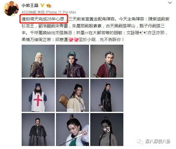 大概是达到了预期的效果暴风雨来得过于猛烈了些,王晶上午发完这主角阵容和定妆照,没多久就给删除了,还特地发了一条微博解释:删掉“是因为是想换上高清照片”(果然古仔怎么可能只配拥有侧脸)
