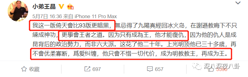 不过老王对此的解释是,他这一版的《倚天》会比93版更“暗黑”,还表示这版的张无忌“已经学会王者之道”,“不再优柔寡断,为爱纠缠”