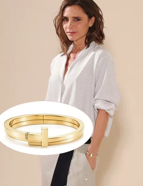 之前贝嫂在参加活动佩戴的蒂芙尼T系列黄金钻石手镯就显得很耀眼~