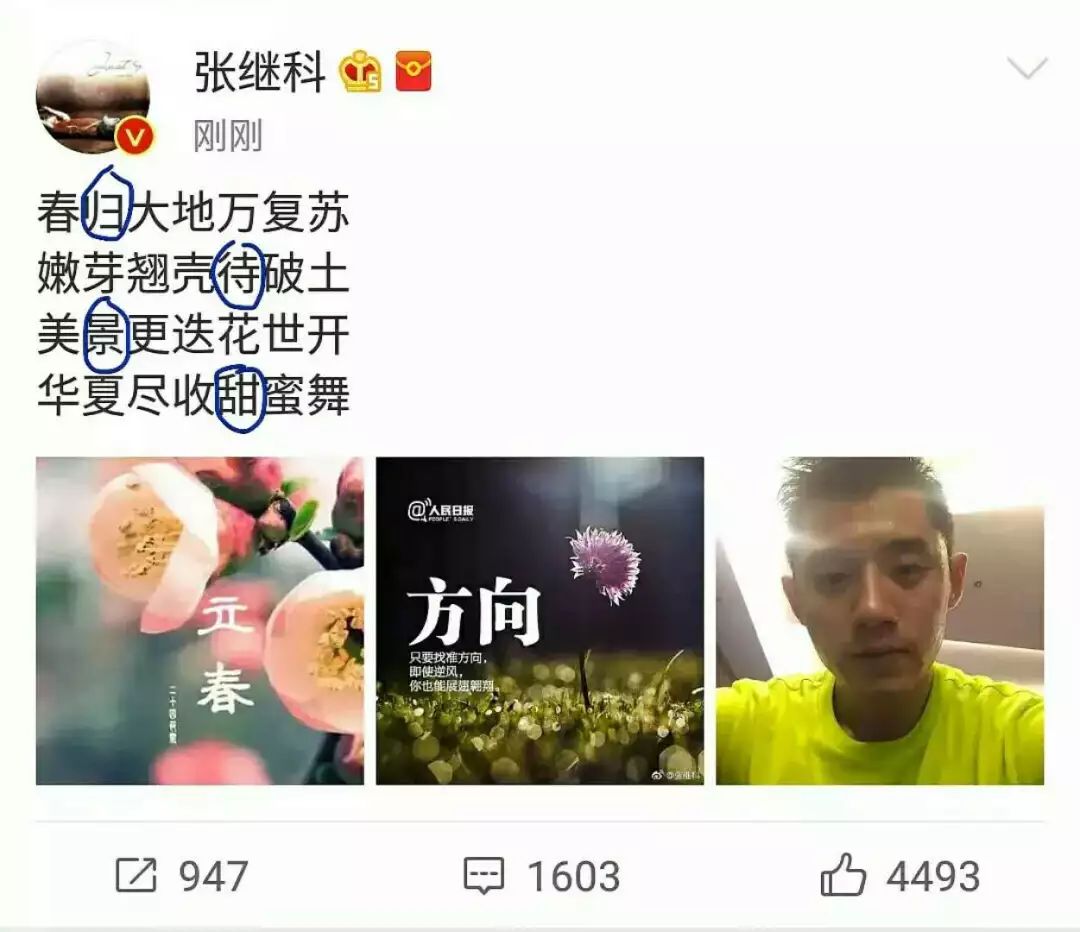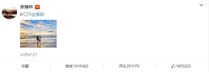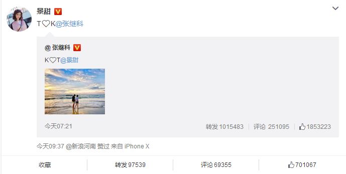 今早7点21分,张继科发布“KT”正式认爱景甜。