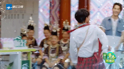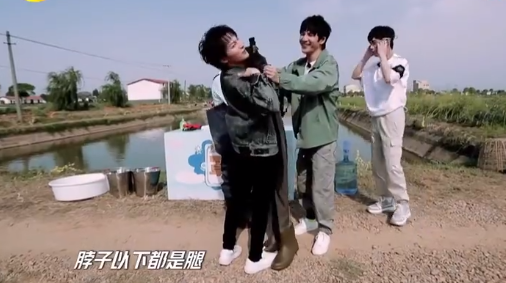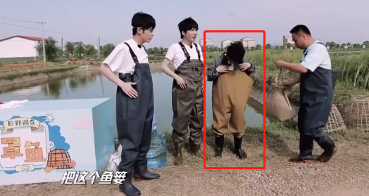 比如在《天天向上》的户外捕鱼环节,大家都要穿上防水裤,唯独周深的画风是这个样子的: