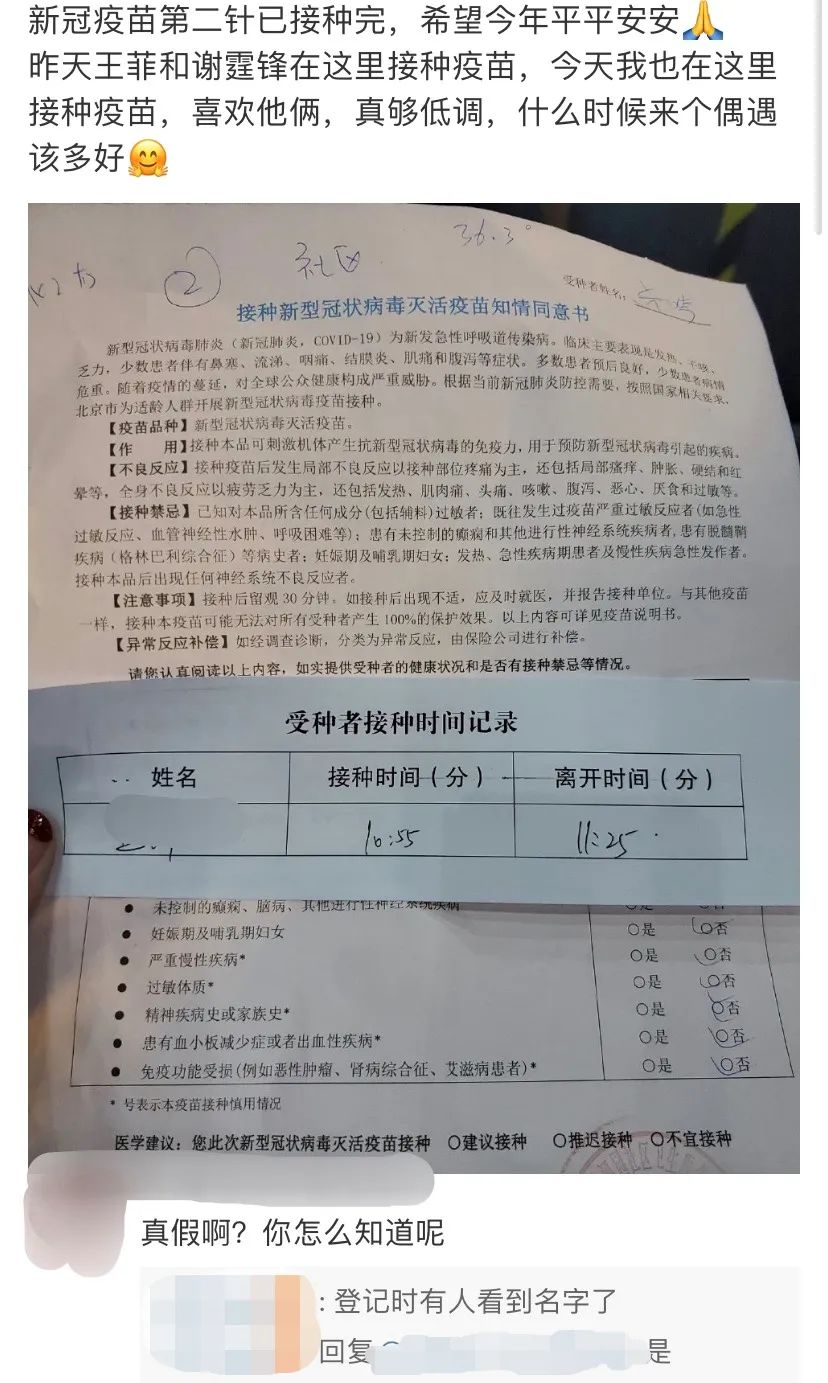 上个月,有位网友走在嗑糖第一线,她在接种新冠疫苗时,意外听到谢霆锋与王菲一起来接种疫苗的消息。