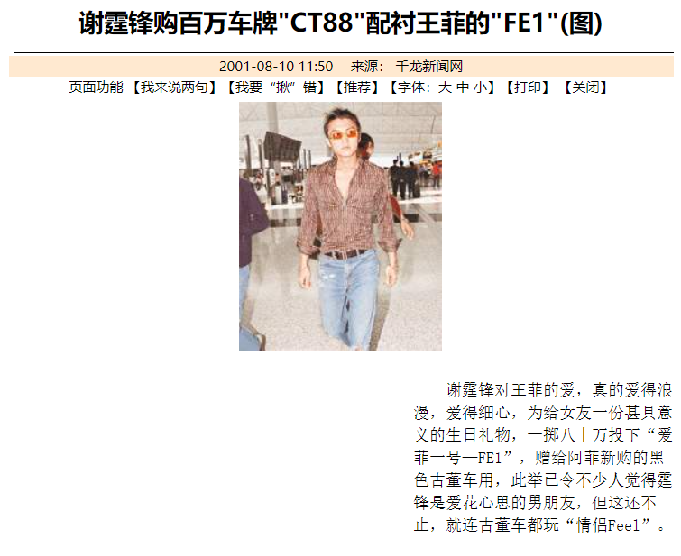 fe1取自王菲的菲字,而88则是因为王菲的生日是八月八日,可以说,谢霆锋用车牌隔空表示自己的爱意。